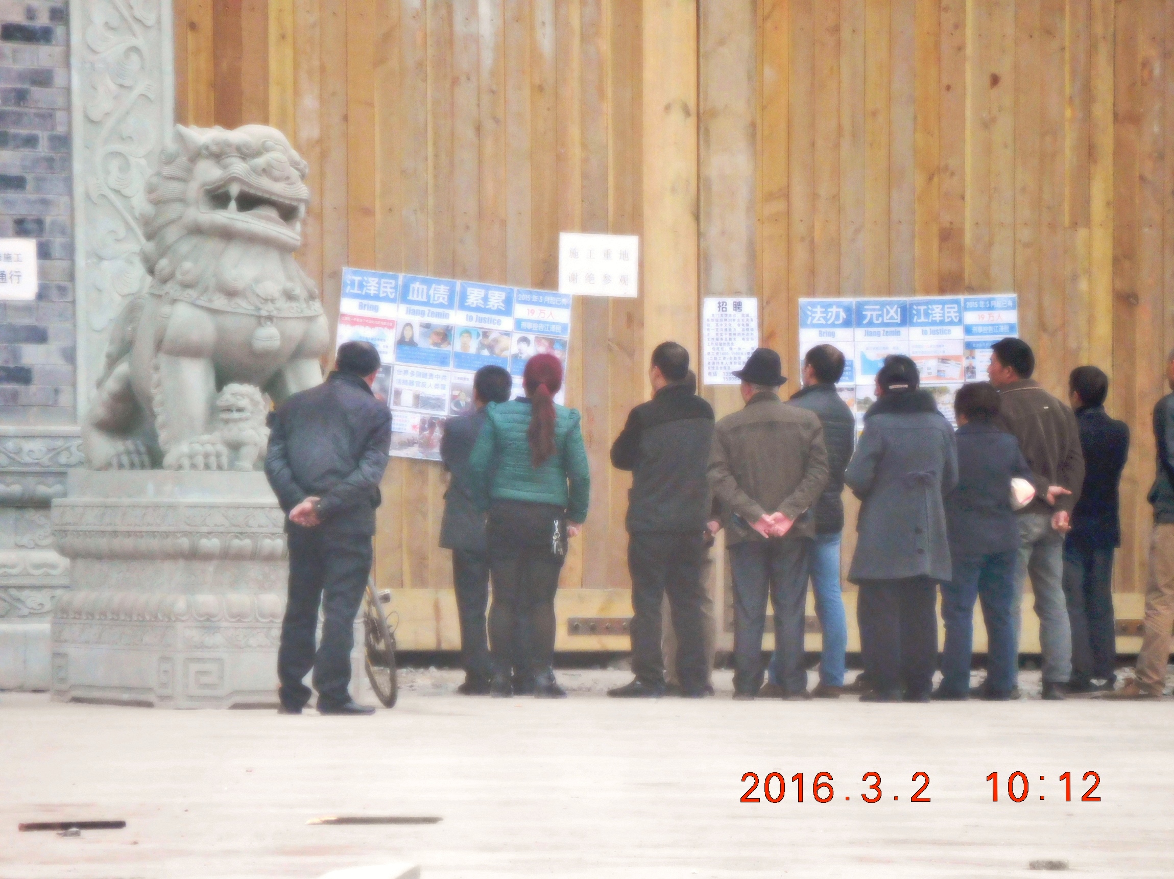 通讯员四川报道)二零一六年二月、三月,四川南充法轮功学员在各处张贴的控告江泽民(诉江)展板和真相粘贴,人们看见后奔走相告,说快去看诉江展板,好大的展板哦,还有好多人拍照,他们说,快拍照,发到网上去……