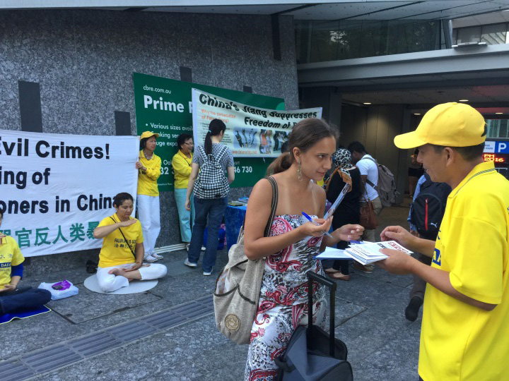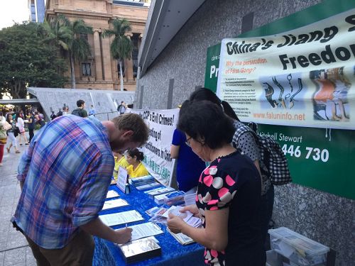 当天是周五,人流熙熙攘攘,许多行人驻足听学员讲真相,纷纷在制止迫害、声援控告迫害法轮功的元凶江泽民的征签簿上签名,还有很多人以自己个人名义在给澳洲总理特恩布尔(Malcolm Turnbull)的明信片上签名,敦促特恩布尔在四月份访华时提出中国法轮功人权问题。