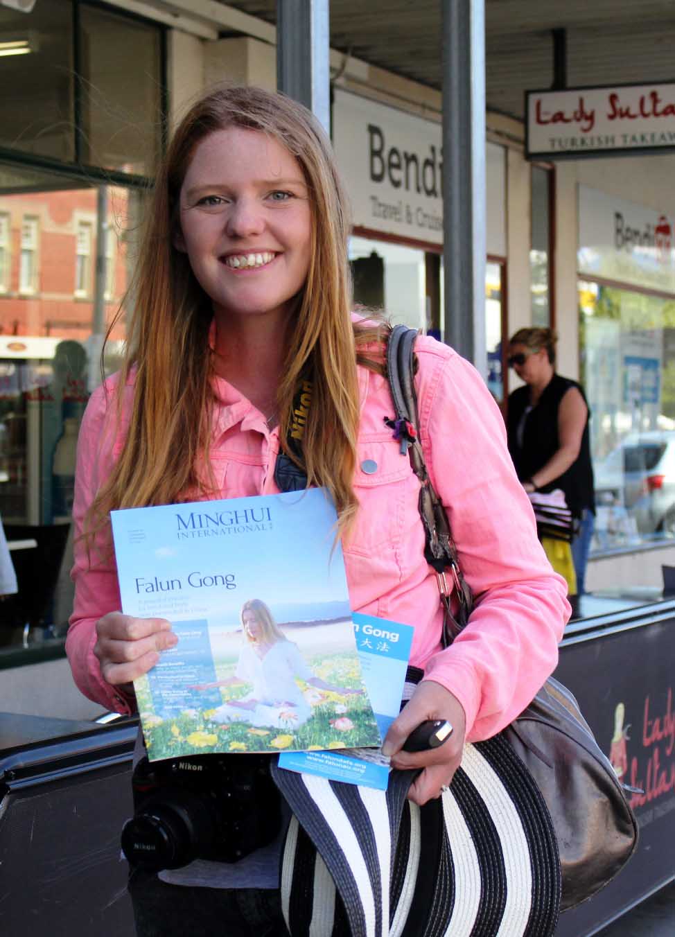 霍奇斯(Cheryl Hodgers)女士退休前是位客服人员,她三年前搬到了班迪戈,今年是第一次观看复活节大游行,也是第一次听说法轮大法,对游行中法轮大法的队伍印象深刻,她说:“不同的方阵采用了不同的颜色,色彩缤纷,还有功法的展示,很好。看起来是一种很好的健身功法,能保持身心的平衡。”在了解了法轮功学员反迫害的真相后,霍奇斯女士表示,在澳洲能够自由炼法轮功,在中国却被中共迫害,“真是令人难以置信,这是耻辱!”
