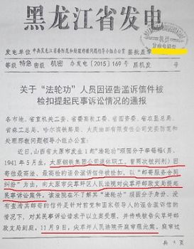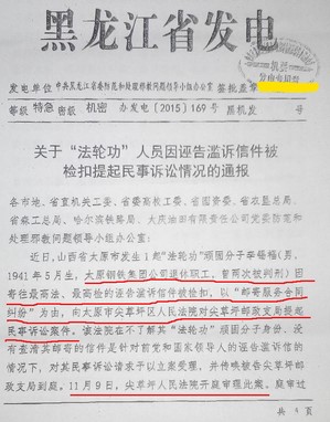黑龙江省“610”密令中提到,因从二零一五年五月开始大量法轮功学员向最高检、最高法(简称两高)邮寄控告江泽民材料,过程中有邮局扣押法轮功学员的控告材料而被告上法庭。密令称,法轮功提告邮局的案件在太原市尖草坪法院立案,并于十一月九日开庭。当法庭得知材料是控告江泽民后,借口原告没有提供邮寄发票等休庭。