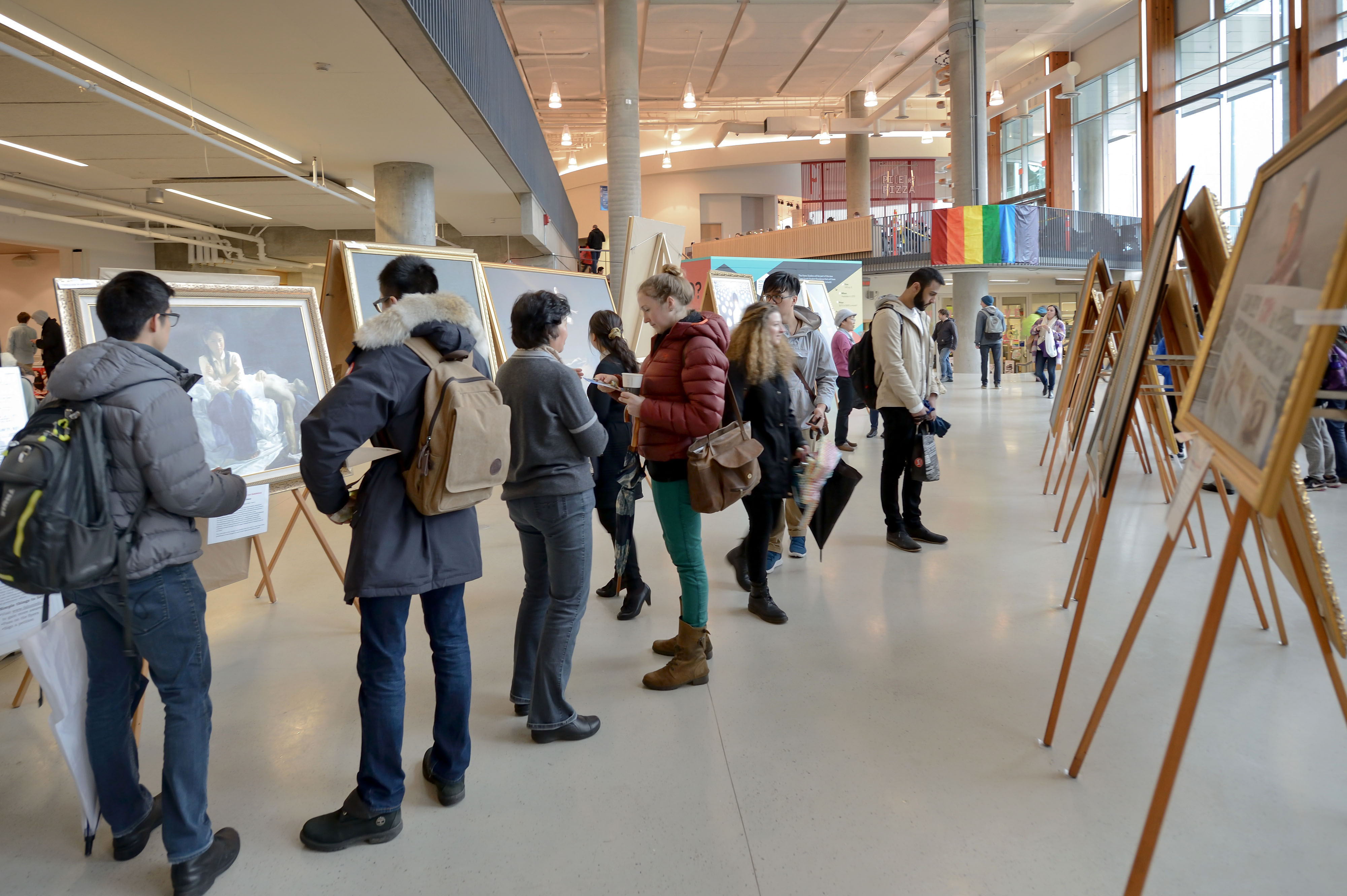 美展在卑诗大学新落成的学生中心举办,展厅宽敞明亮,参观者纷至沓来,除了该校的师生外,还有不少的外来游客,一些参观者是听到朋友的介绍,慕名专程来观赏的。美展也吸引了卑诗大学的媒体,大学的电台已经商定要专门采访法轮功。
