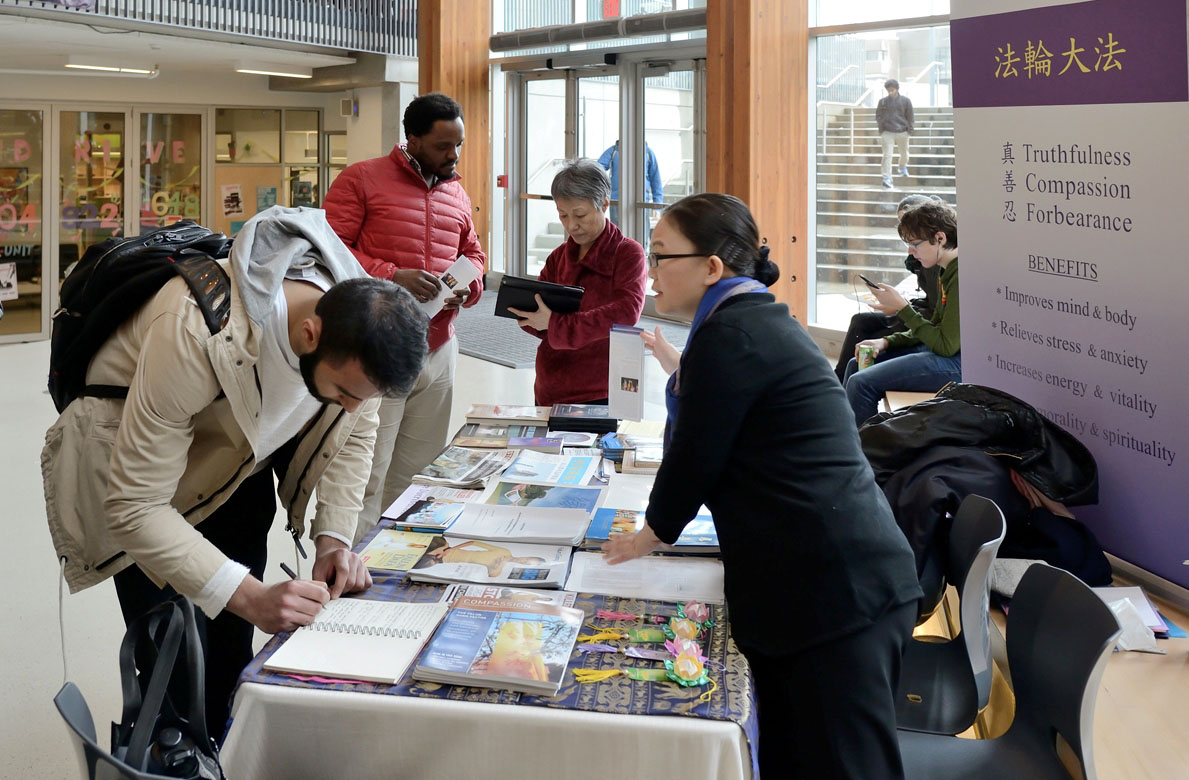 卑诗大学有不少来自中国的留学生,他们看画展看得特别仔细,感到震撼。有的说,在国内也知道法轮功受迫害,但不知道具体情况,看画展就觉得很直观,特别听学员介绍了天安门自焚真相,活摘器官真相,很受触动,多人当场办了三退(退出中共党、团、队,简称三退)。