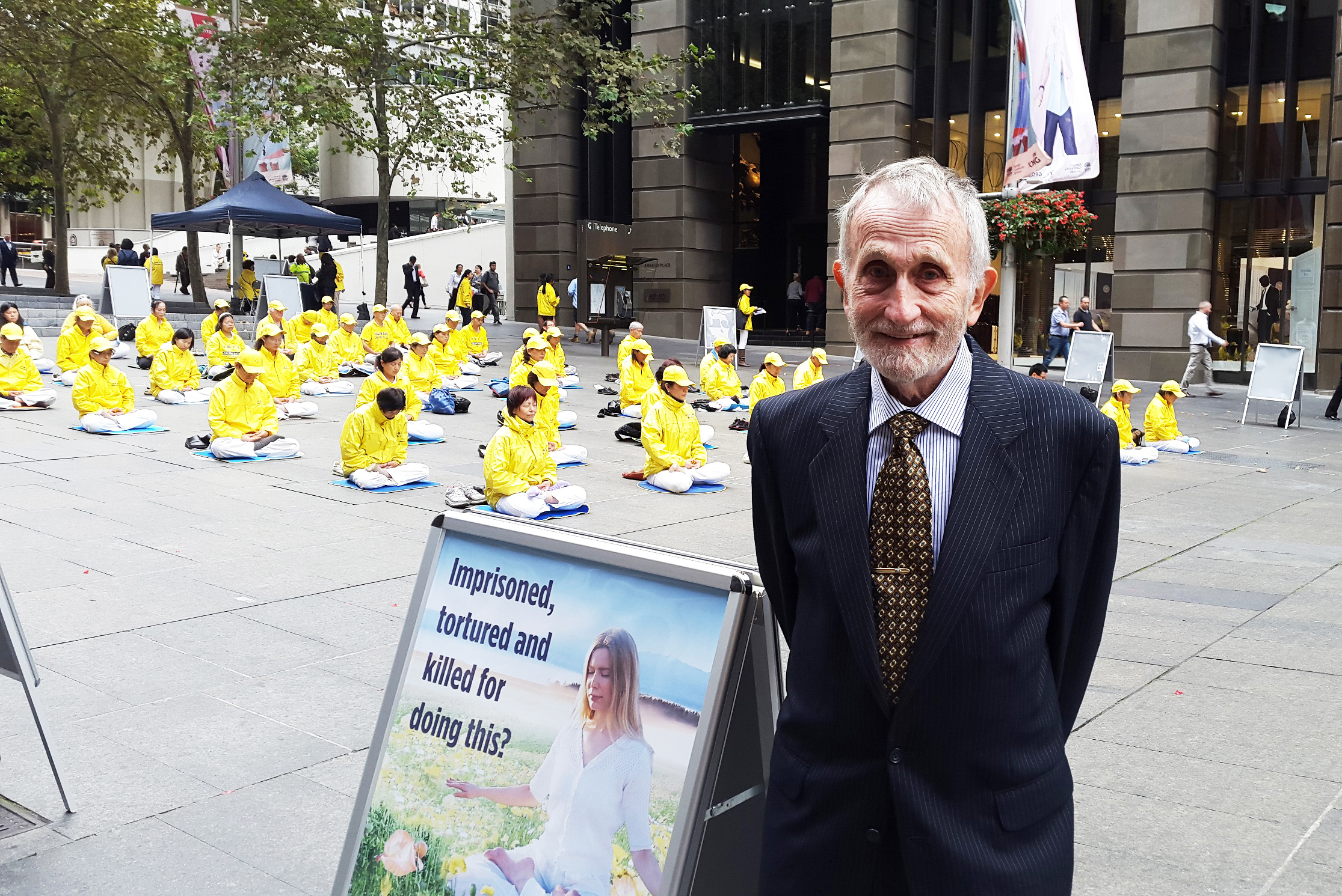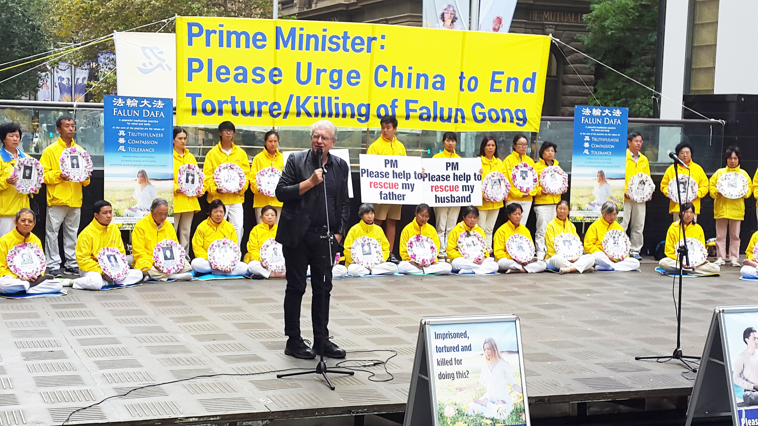 他面对着法轮功学员说:“我们要求中国政府释放你们所有的亲人。你们有权利要求我们的总理表达你们的意愿。我愿与你们一起呼吁澳洲总理在中国之行中提出人权问题。我为你们祝福。我尊重你们信仰自由的权利,这一权利必须是全球性的。”
