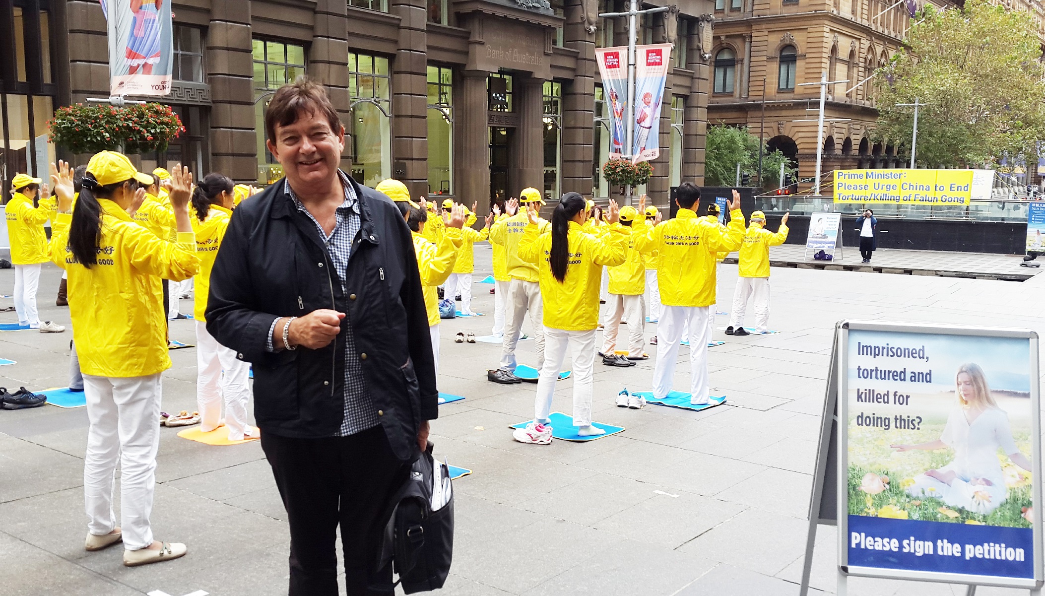 珠宝商约翰•沃特海姆(John Wertheim ) 在邻近珠宝店工作,下班时看到法轮功学员还在那里祥和地打坐,他很感触地站在一旁看。看到真相横幅写的“请总理敦促中国停止对法轮功的酷刑和杀戮”,他感觉不可思议。