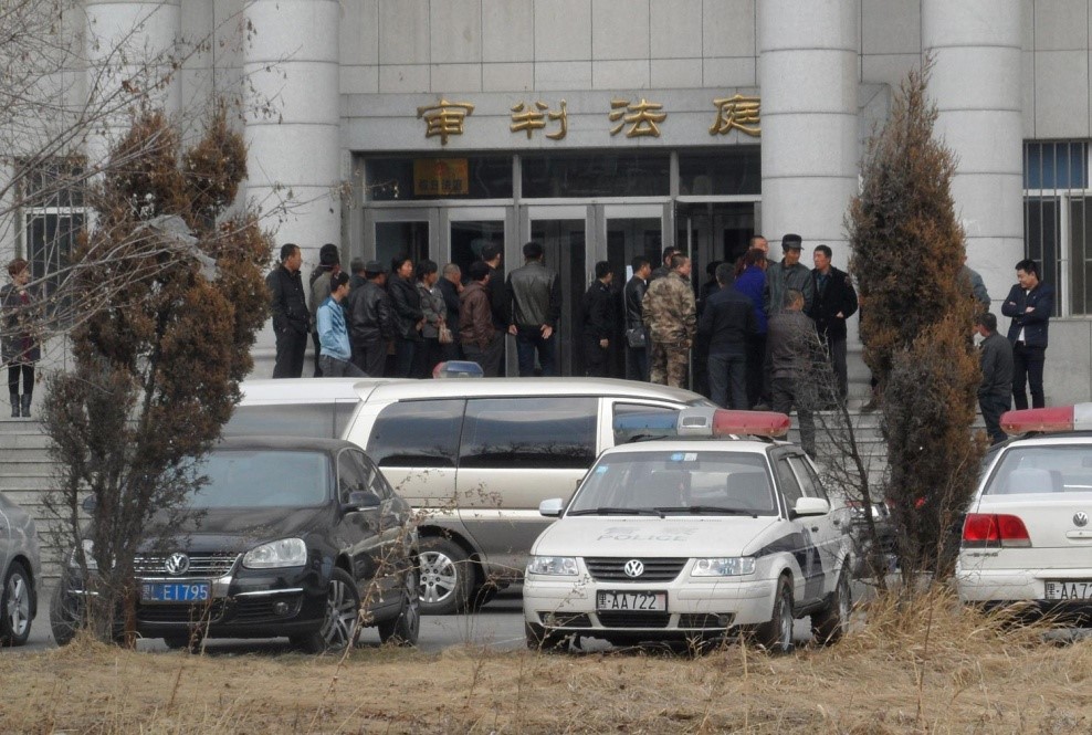 “610”人员早已在法院等候了,韩甸派出所所长阮春鹏副所长张锐,双城公安局国保大队王玉彪等,他们都穿着便衣在走廊里来回走,横眉立目眼睛四外在人群中查看,现场还有韩甸镇政府干部姓于的,荣生村的村官六家子屯村官,都来到审判一厅。外面还有很多便衣警察在围观的人群中。