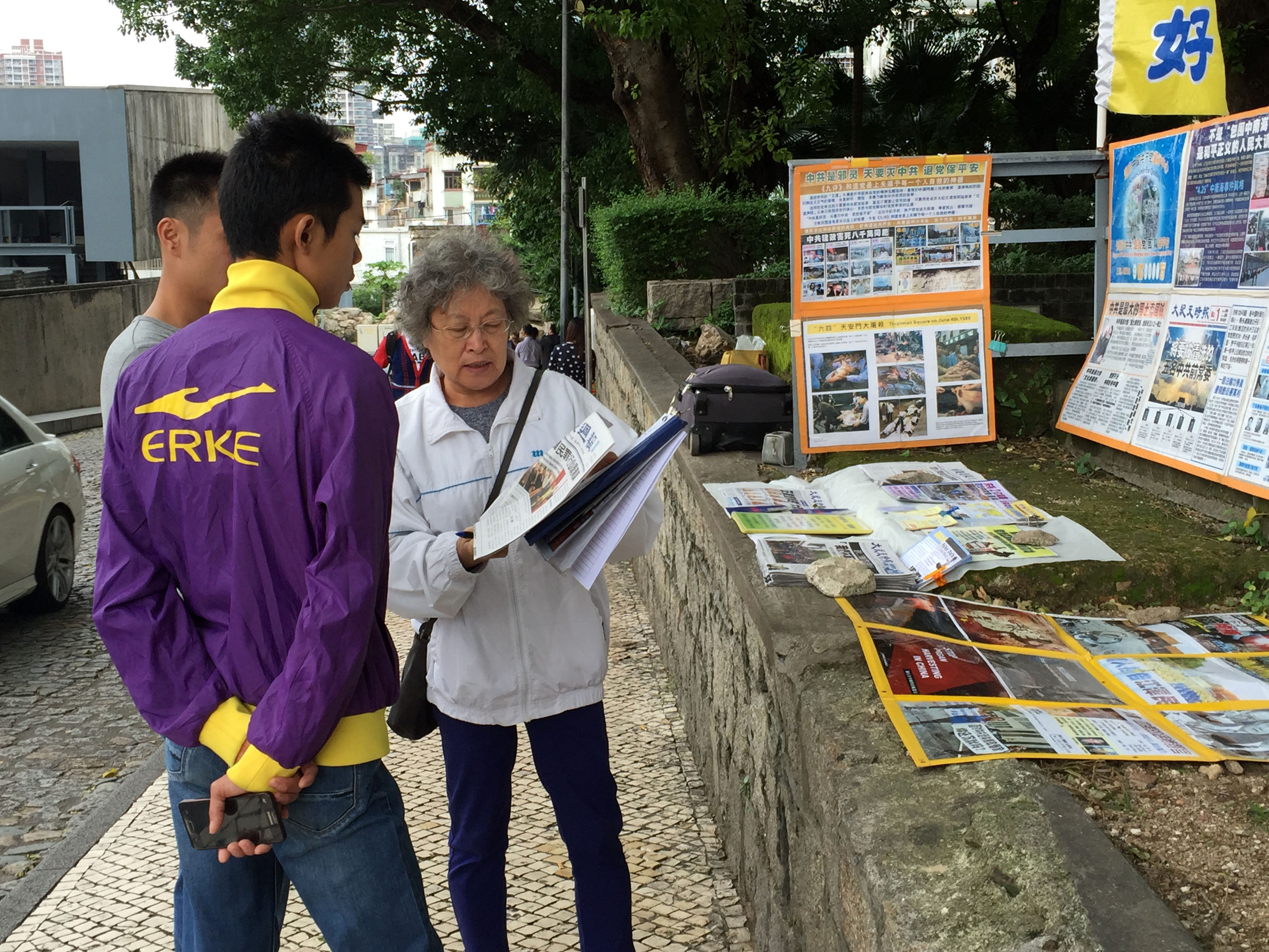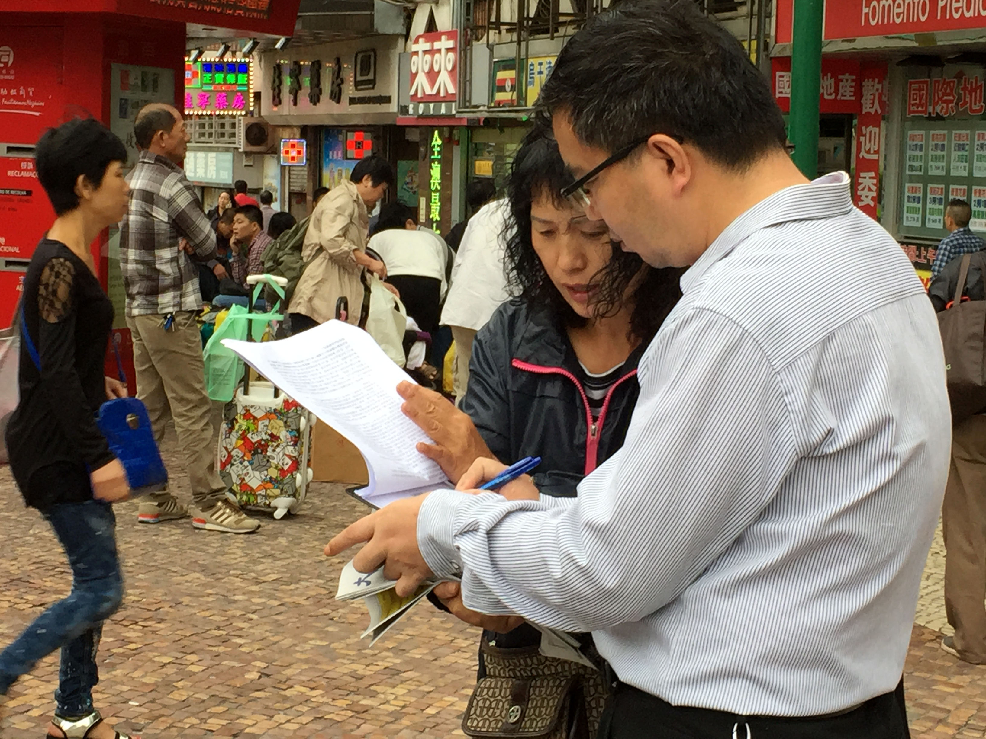 【明慧网二零一六年四月二十日】为了让更多民众了解中共迫害法轮功的罪恶,并声援控告江泽民大潮,自二零一五年八月份起,澳门法轮功学员在澳门世界遗产景点玫瑰堂前地、大三巴等地征集签名,得到了澳门各界市民的支持,其中包括澳门立法会议员区锦新及民运人士利建润等。