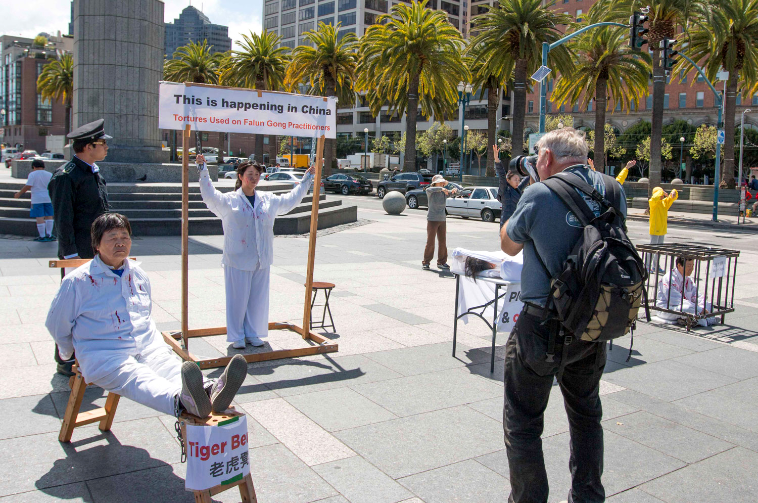渡船大厦位于旧金山旅游景点渔人码头附近,有繁忙的购物区和农贸市场,酷刑展吸引了很多路人驻足观看。展示的酷刑有吊打、坐老虎凳、活摘器官、关水笼子等。活生生的酷刑场面使路人震惊于在当今的文明社会,居然有如此邪恶的事情发生,他们表示中共太恐怖,太邪恶了,都表示支持法轮功学员反迫害。