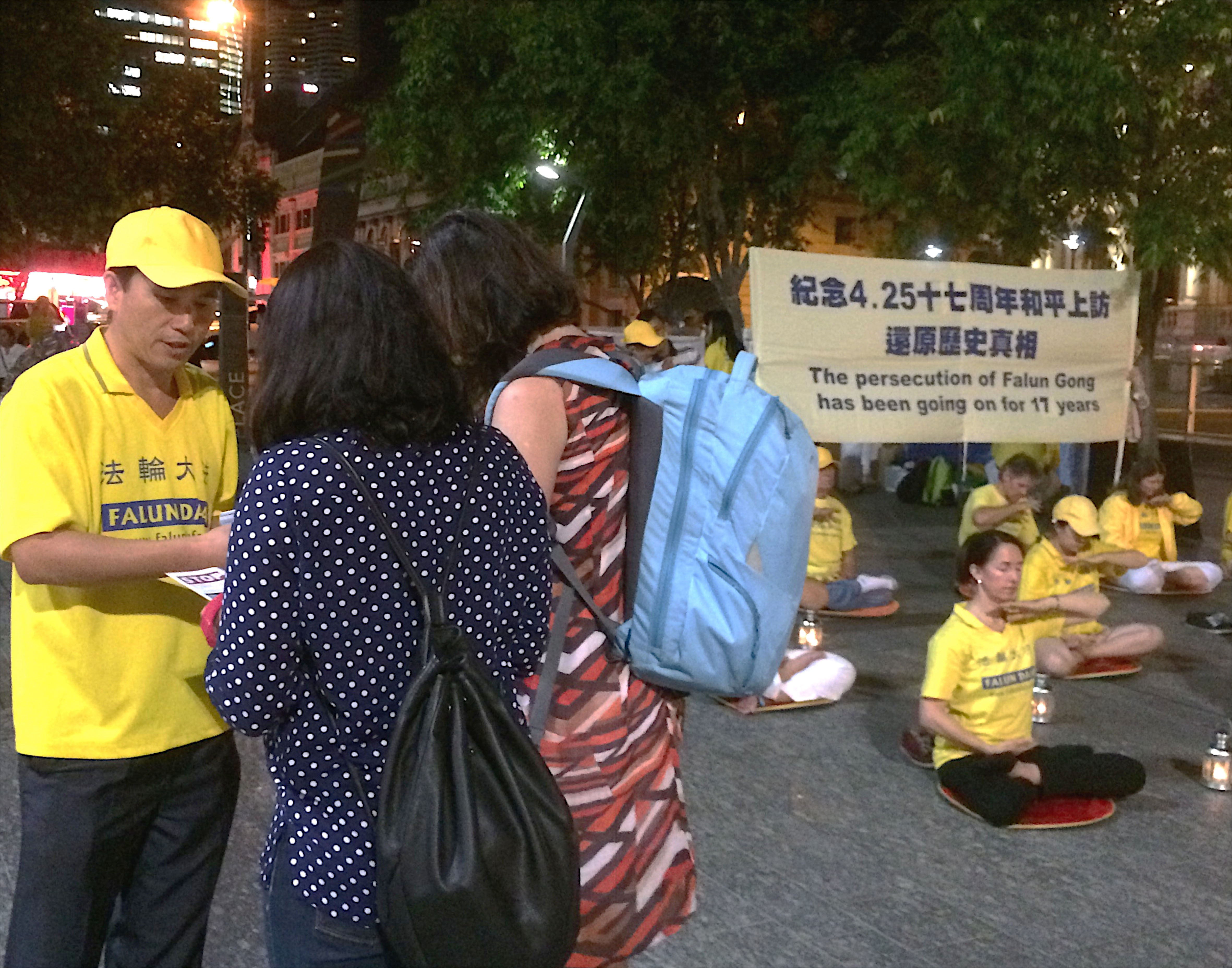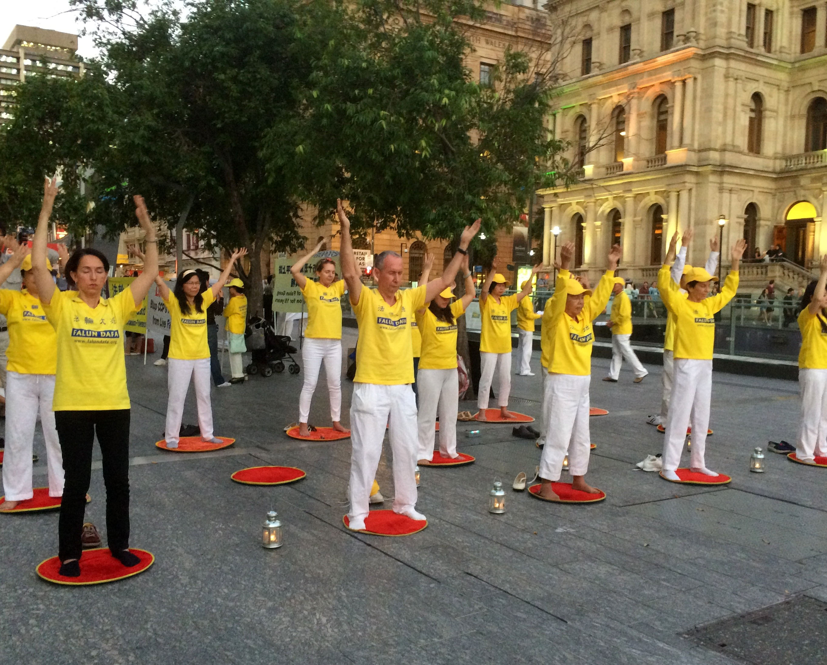 【明慧网二零一六年四月二十四日】(明慧记者澳洲布里斯本报道)二零一六年四月二十三日下午至晚间,澳洲昆士兰法轮功学员在布里斯本市中心的布里斯本广场(Brisbane Square)举办了纪念“四•二五”和平上访十七周年的活动。学员拉横幅、发资料、讲真相、征签反迫害反活摘。部分学员集体炼功,展示功法,晚间还举行了烛光守夜活动。