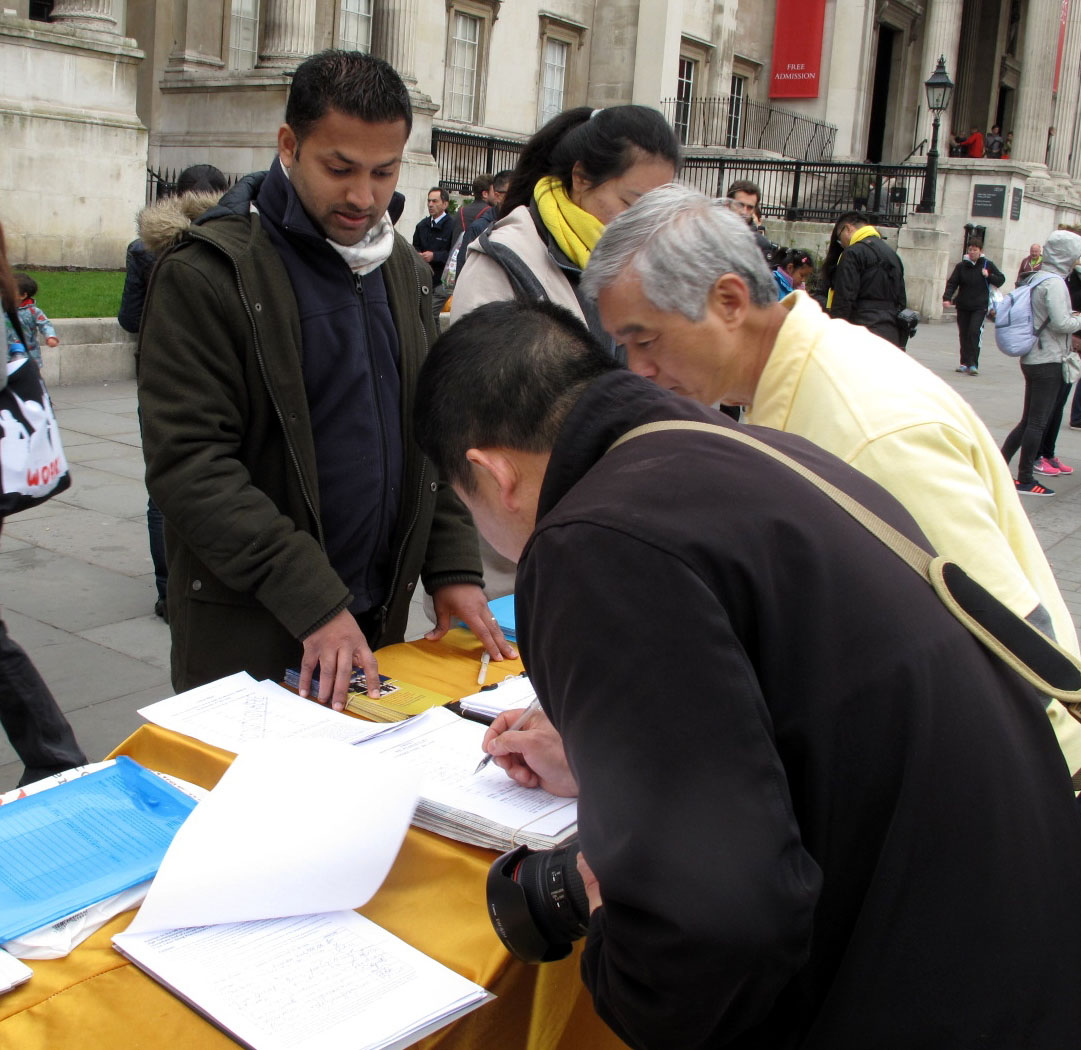 还有的民众在了解真相,特别是中共活摘法轮功学员器官罪行后立即表示要去传播真相、尽快制止迫害。在UCL工作的年轻人杰克(Jack)和他的一位朋友在反迫害征签簿签名后表示:“这(活摘器官)是最野蛮的行为。这和我们每一个人都相关。我要让每一个人都知道这事儿。”