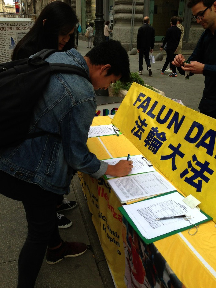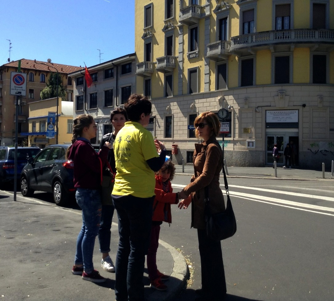 在米兰市中心,学员跟两个小伙子讲真相,一路跟着讲,一直讲到地铁口,最后两个小伙子明白真相,爽快地退出了中共团组织。学员向他们告别时,其中一个小伙子恭恭敬敬地向学员合十了三次。