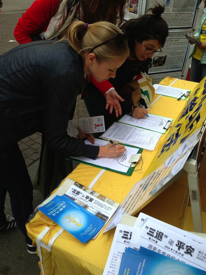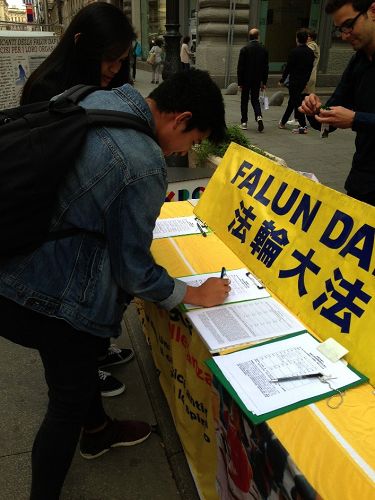 整个活动中,很多意大利民众和其他国家的游客都明白了真相,欣然签名举报迫害元凶江泽民,还有很多人对法轮功功法很感兴趣,询问如何可以学炼。
