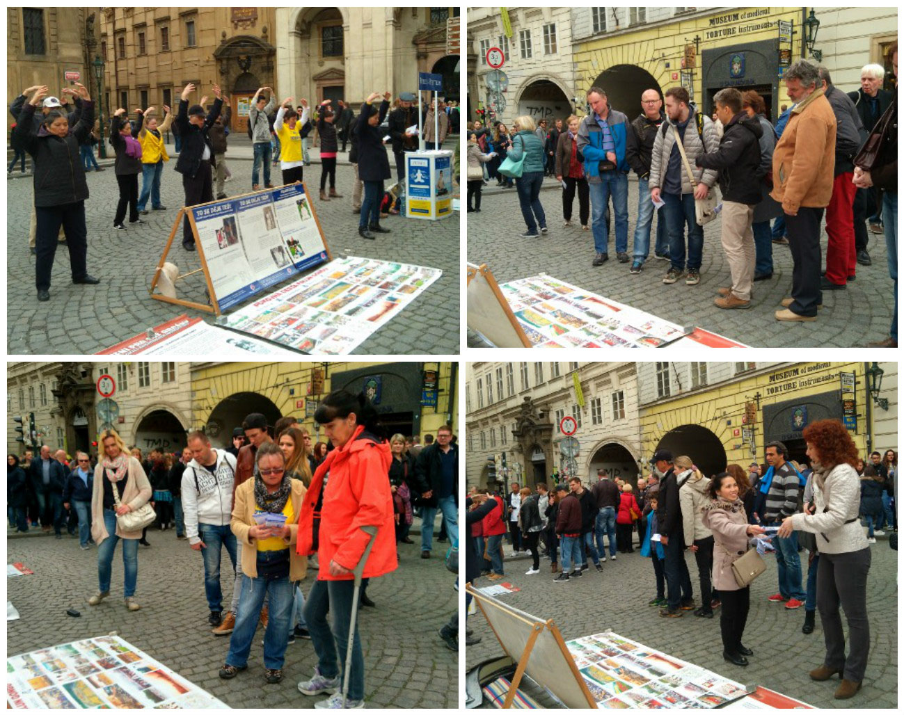 法轮功学员们手拿中文、英文、德文、法文、捷克文等多种不同文字的真相资料派发给过往游人。一位年轻的中国游客拿到一张传单“迎接没有中共的新纪元”,当他念到传单上面有关目前中国现状的一句话“满朝文武藏绿卡,半壁江山养红颜”时,就对学员说,“你们上网通过微信往外发呀!”