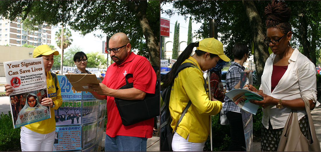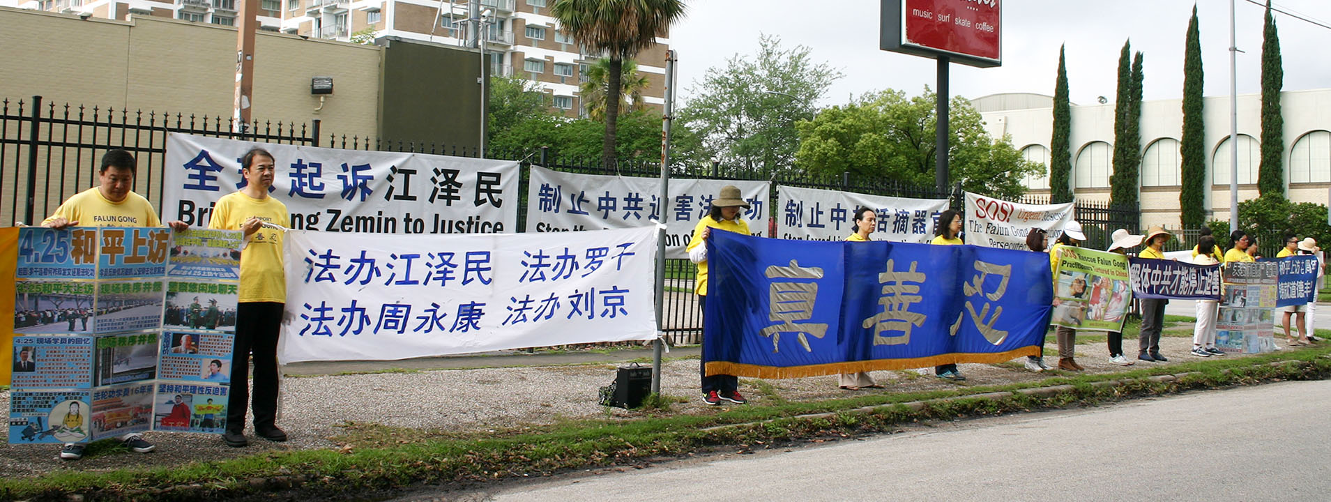 四月二十五日天气晴朗,上午九点,法轮功学员在中领馆前手持中英文横幅:“法办江泽民”、“停止活摘器官”、“停止迫害法轮功”、“纪念四二五和平上访17周年”等,中领馆位于休士顿蒙确大道(Montrose Blvd),来往车辆很多,出入中领馆签证的华人及其他族裔人士,对法轮功的活动予以关注。