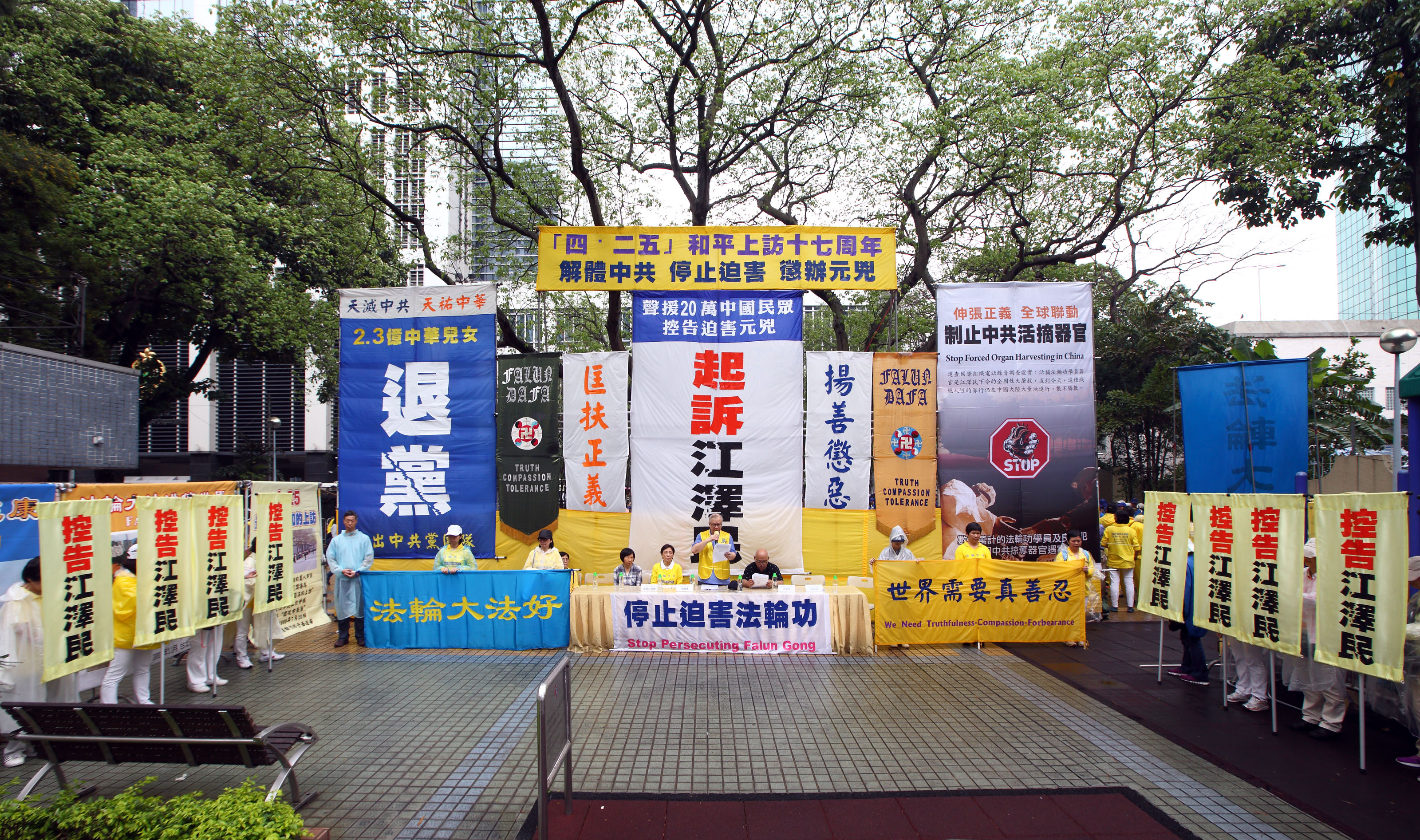 集会于中午在北角英皇道游乐场举行,多位议员及社会知名人士或到场声援,或透过录音发言,表达对法轮功的敬佩及支持,他们谴责中共迫害法轮功所犯下的罪行,支持并呼吁早日将江泽民绳之以法。