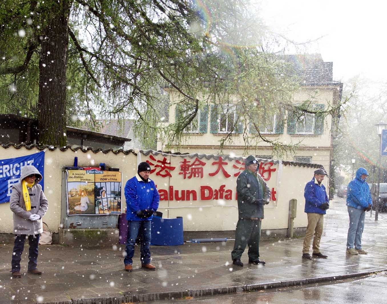 【明慧网二零一六年四月二十七日】(明慧记者德祥德国慕尼黑报道)二零一六年四月二十五日,德国慕尼黑及周边地区的法轮功学员,在慕尼黑中领馆前举办了纪念四二五和平上访十七周年的活动,呼吁停止迫害法轮功,法办迫害法轮功的元凶江泽民。活动当日,慕尼黑天气变化很大,时而风雪交加,时而春光明媚。法轮功学员在风雪中的坚持感动了周边的民众和过路的行人,有民众表示感受到法轮功学员和平理性的巨大力量,不少人表示支持法轮功学员的行动,为他们加油。