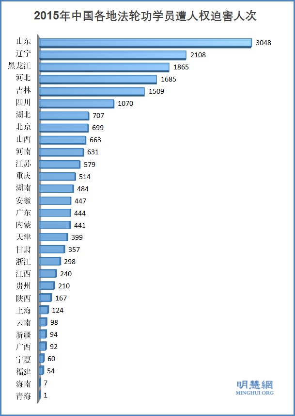 统计显示,2015年明慧网曝光的遭绑架、抄家和骚扰迫害的法轮功学员至少有19095人次,涉及中国大陆30个省市,至少有18895个家庭遭到严重骚扰。迫害最严重的地区是:山东至少发生3048人次的迫害,涉及至少3015个家庭。辽宁至少发生2108人次的迫害,涉及至少2094个家庭。黑龙江至少有1865人次遭受迫害,涉及至少1850个家庭。河北至少发生1685人次的迫害,至少涉及1663个家庭。吉林至少发生1509人次的迫害,至少涉及1495个家庭。四川至少发生1070人次的迫害,至少涉及1063个家庭。湖北至少发生707人次的迫害,至少涉及 703个家庭。北京至少发生699人次的迫害,至少涉及674个家庭。山西至少发生663人次的迫害,至少涉及656个家庭。河南至少发生631人次的迫害,至少涉及628个家庭。其它见图表所示。
