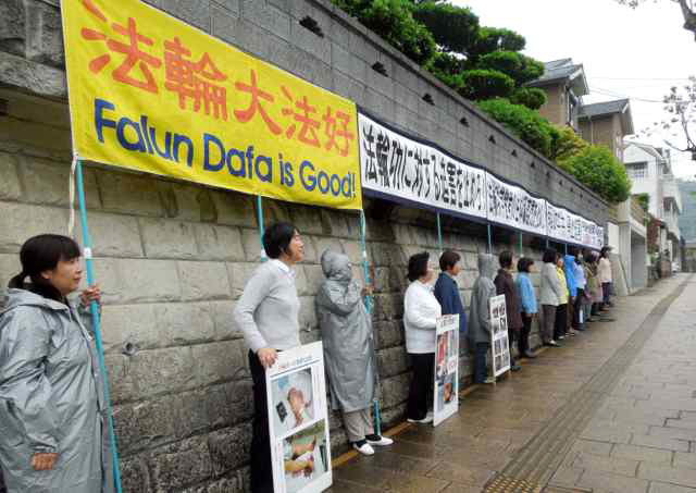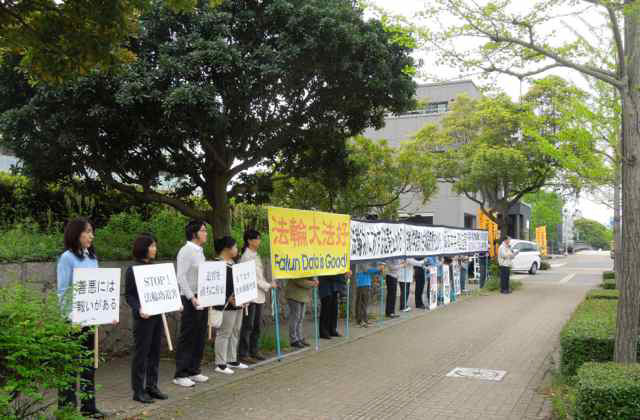 图1-3:二零一六年四月二十三日,日本熊本地区的法轮功学员在九州岛地区的福冈和长崎中领馆前集会,纪念“四二五”,呼吁制止迫害,法办元凶。