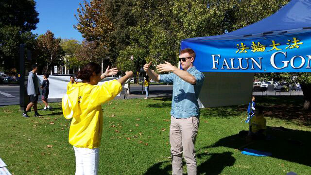 正在参加一个课程培训的Dannell午休时间经过广场,感受到祥和慈悲的能量场,了解真相后,他马上签名支持反迫害,并对法轮功产生兴趣,询问哪里可以学。学员热情邀请他一起炼,他欣然地认真学起了功法。临走时,他留下联系方式,表示会再来。平和的炼功场面也引起马路对面一群学生的关注,她们也在一起学着做抱轮动作。