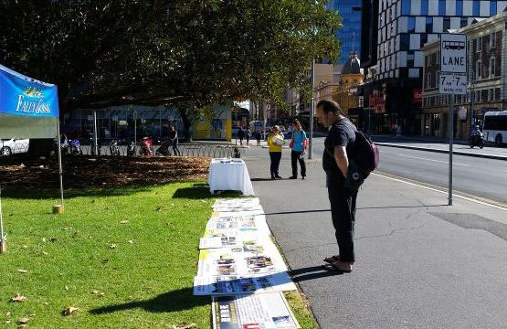 南半球的秋日晴朗气爽,阿德雷德市中心车辆、行人川流不息,身着金黄色服装的法轮功学员平静祥和的炼功场面,吸引着人们的目光。人们专注看展板,主动拿资料,签名共同制止中共的罪恶。