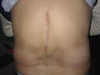 照片说明:大陆大法弟子青岩在一次煤矿井下落顶事故,被压在巨石下,造成脊椎腰椎的第一、二、三节压缩性骨折,脊椎神经受到压迫,腰部以下瘫痪没知觉,当时抢救手术做了八个多小时,做了腰椎钢板内固定手术,骨折受伤的脊椎用两片十几厘米的钢板夹起来,两头用螺丝固定。青岩后又做了钢板取出手术,手术后长期坐轮椅、扶双拐生活。他曾去过天津医院、天津骨科医院、天津中医院、北京协和医院、天坛医院、宣武医院、朝阳医院、北京医院、积水潭医院、同仁医院等大医院,求医多年无果。青岩一九九七年参加法轮大法修炼后,他坐在轮椅上开始炼功,身体一天天的好转,到二零零零年左右,他彻底扔掉双拐轮椅,开始正常生活。照片是青岩目前康复后的后背照,可以看到,脊柱处痊愈的伤痕有十五厘米。
