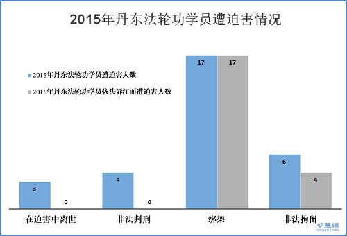 据不完全统计,二零一五年,丹东法轮功学员因长期的迫害,含冤离世的、遭绑架、非法拘留、判刑共有三十人,其中因为诉江遭受迫害的占百分之七十。具体情况如下图: