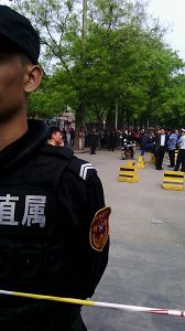 法院门前戒备森严,动用大批特警拉起警戒线,左右五十米内不许人靠近,就连马路对面也有特警驱逐行人。还有好多便衣,有的便衣摄像。当指出他们违法,说既然录像,敢拿到电视上播放吗?让人们看看你们贴公告说公开开庭,为什么不让我们旁听?他们哑口无言,躲到树后继续偷偷摸摸拍。