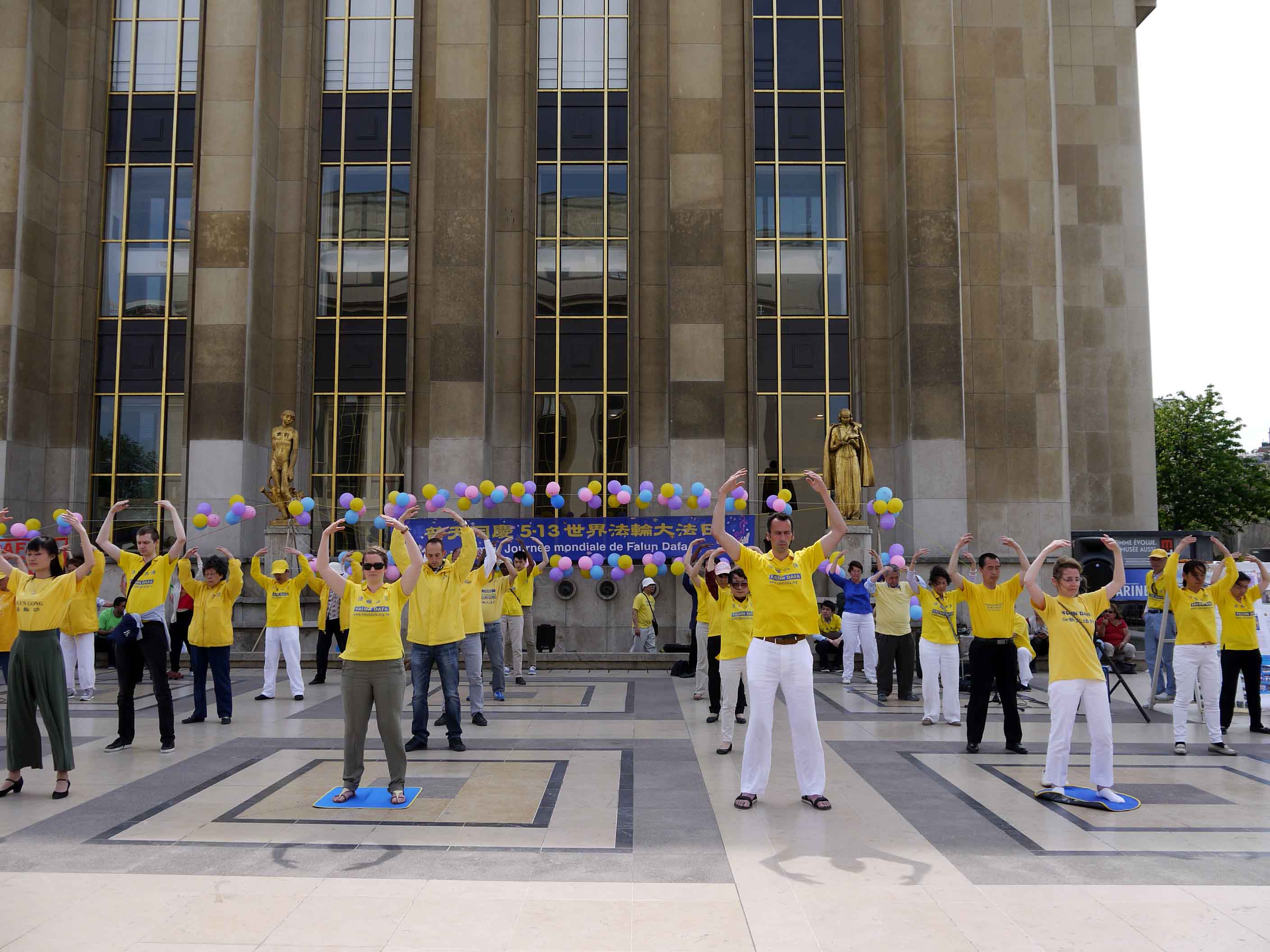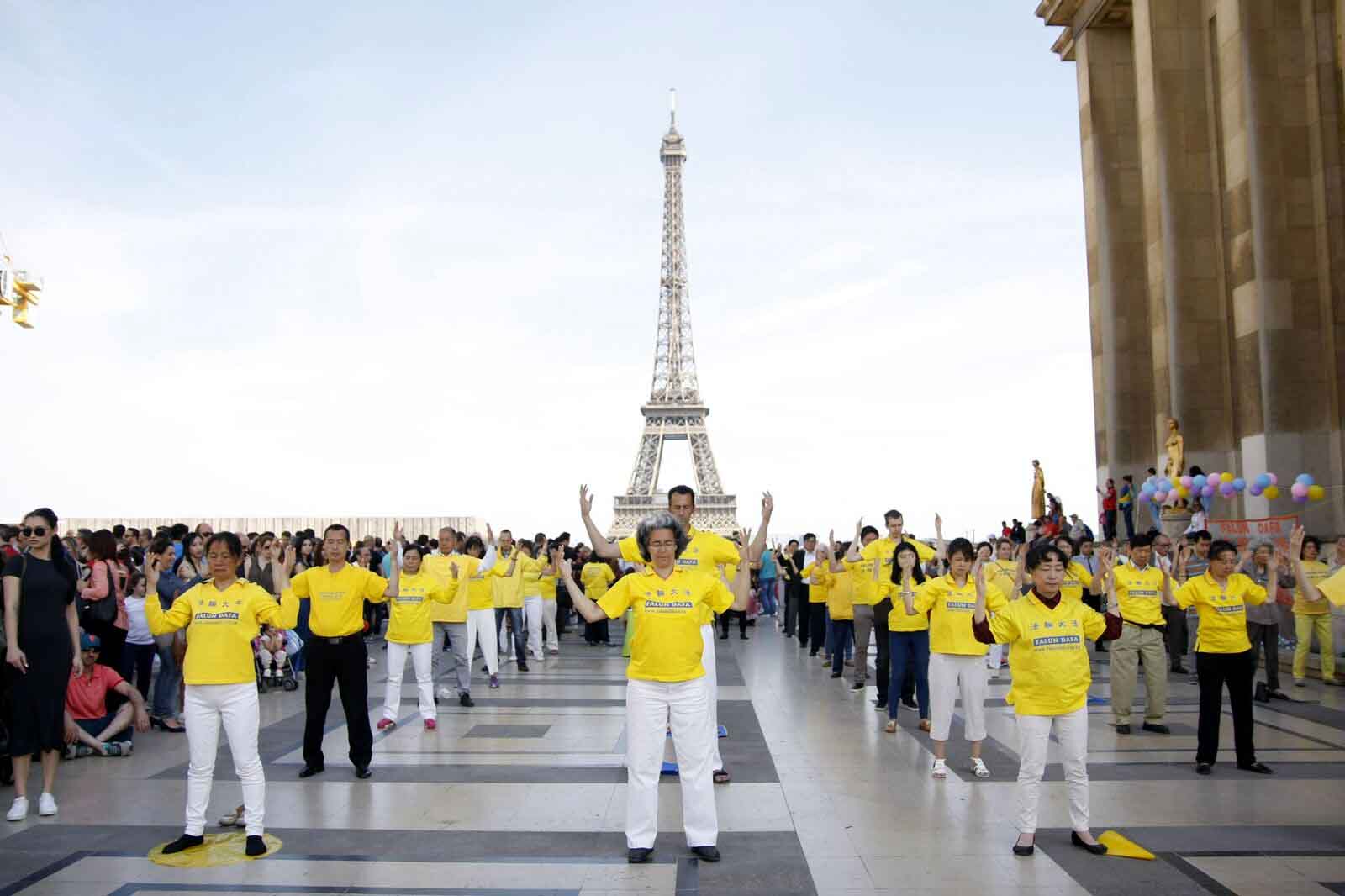 ![]() 图1-3:二零一六年五月八日星期日下午,法国法轮功学员聚集在艾菲尔铁塔下的人权广场上,举办庆祝“五一三”世界法轮大法日,并表达对大法师父的感恩。图为法轮功学员集体炼功,向世人展示大法的美好。 |