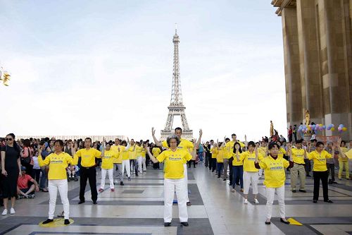 当天下午,艾菲尔铁塔下的人权广场上人流如潮。法轮功学员表演了传统乐器演奏,优美的民间舞蹈,安静、祥和的炼功、打坐,吸引了游人的注意力,他们围观、拍摄,鼓掌、喝彩。另一边,同时摆放了真相展板,人们了解真相后都在征签表上签字,支持法轮功反迫害。