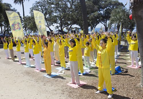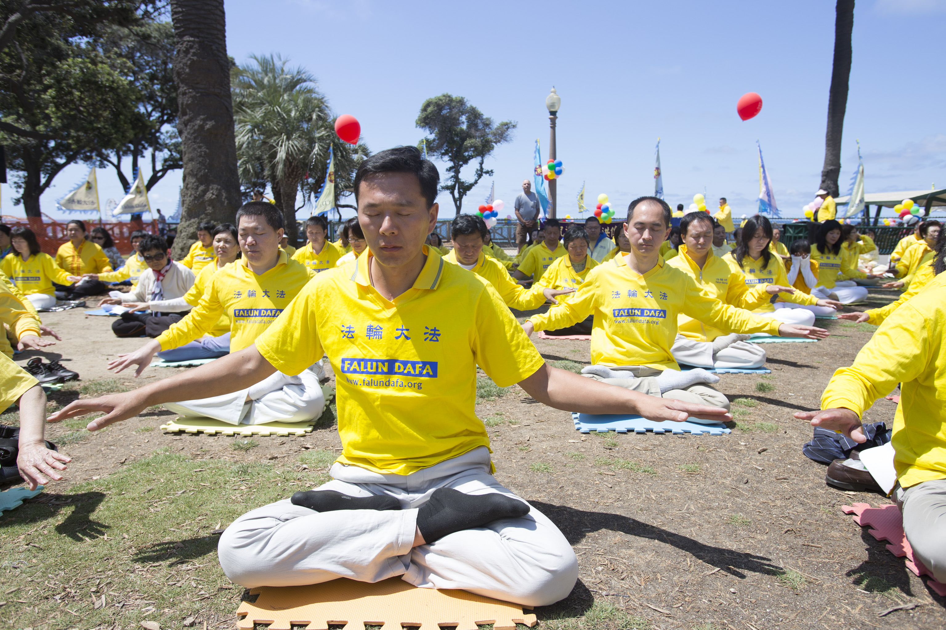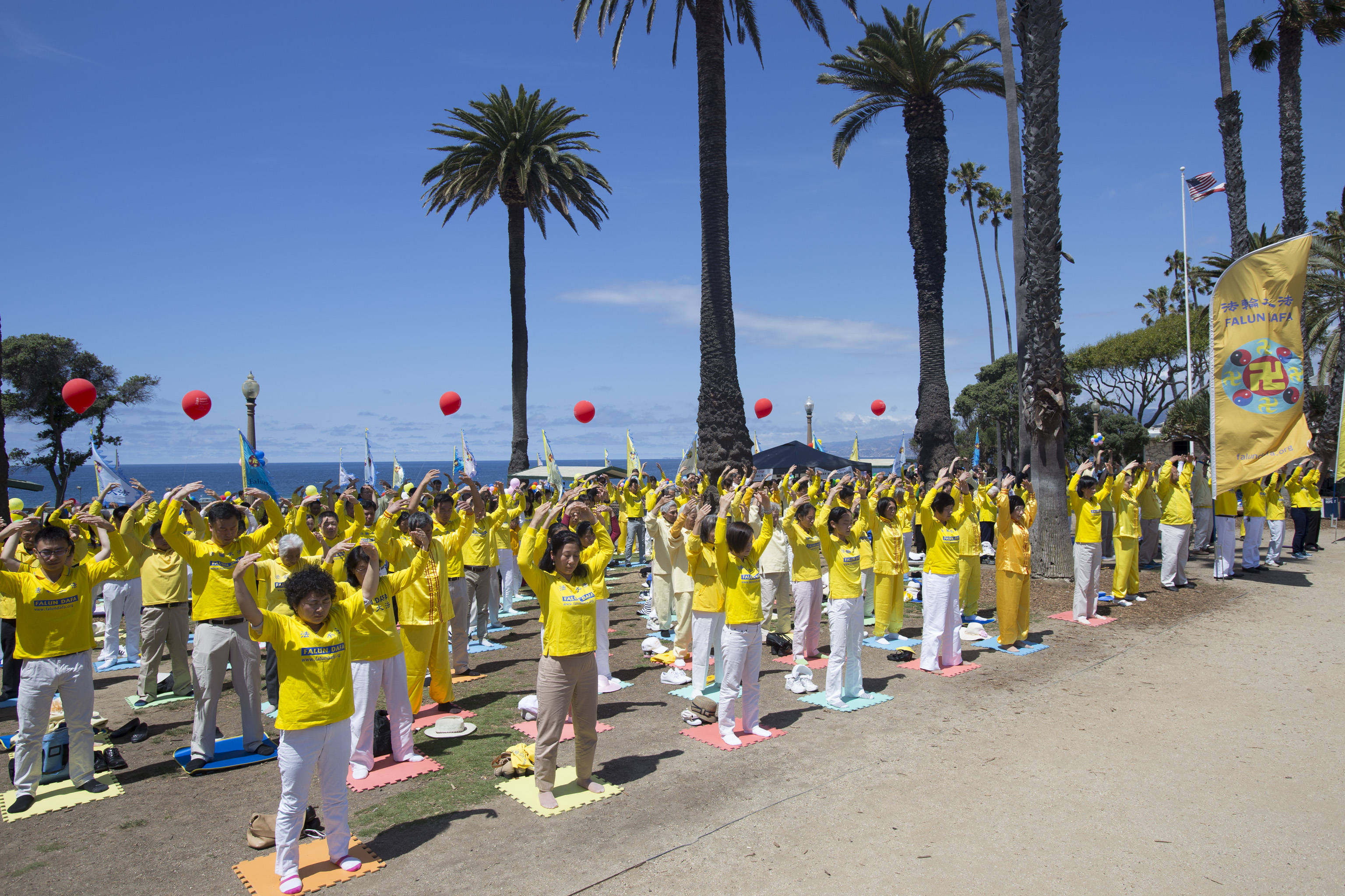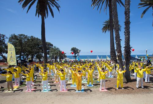 ![]() 图1-4:庆祝世界法轮大法日,二零一六年五月八日,洛杉矶学员在圣莫妮卡码头公园集体炼功。 |