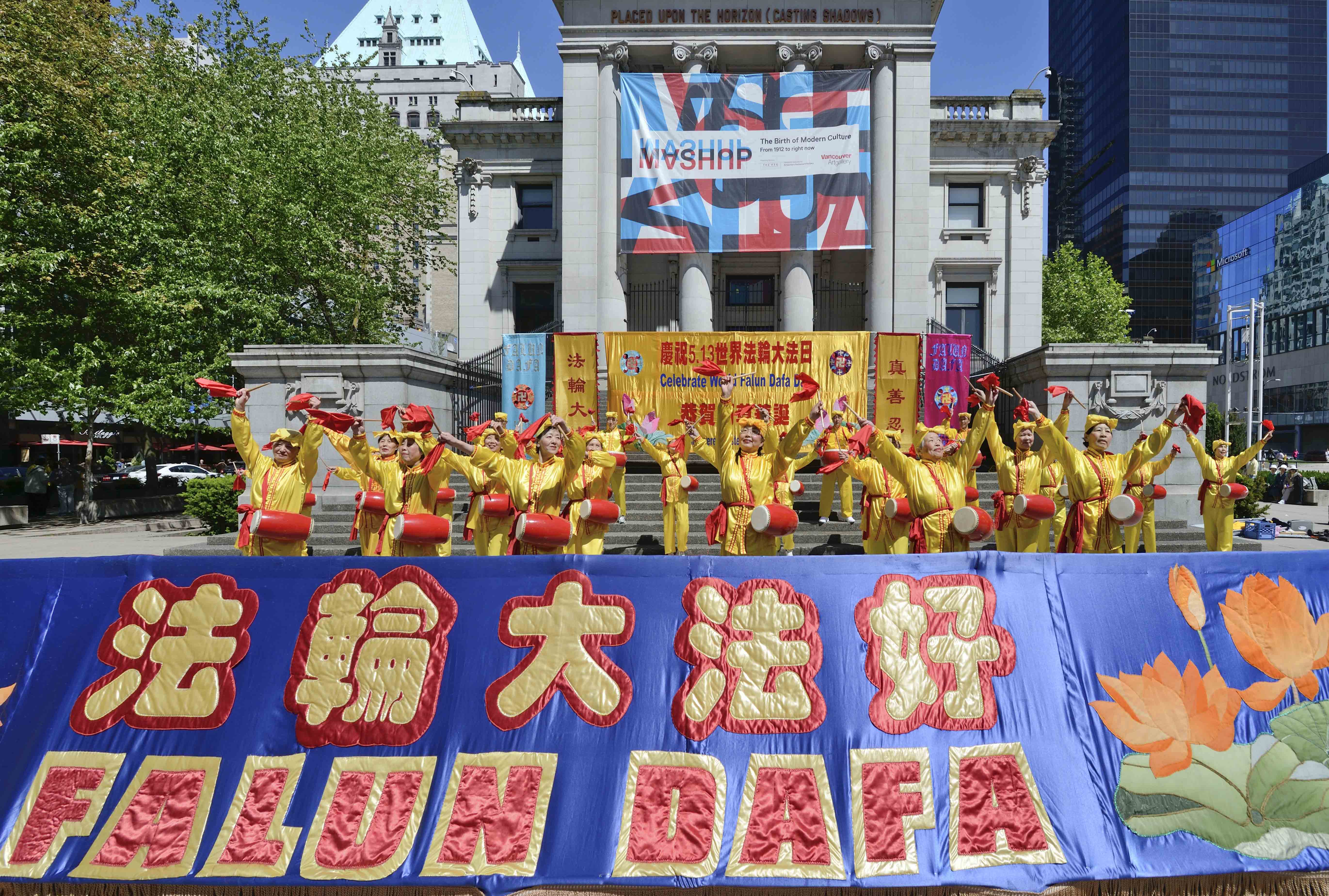 图1:温哥华法轮功学员在市中心艺术馆前举行活动,庆祝法轮功创始人李洪志先生六十五华诞。