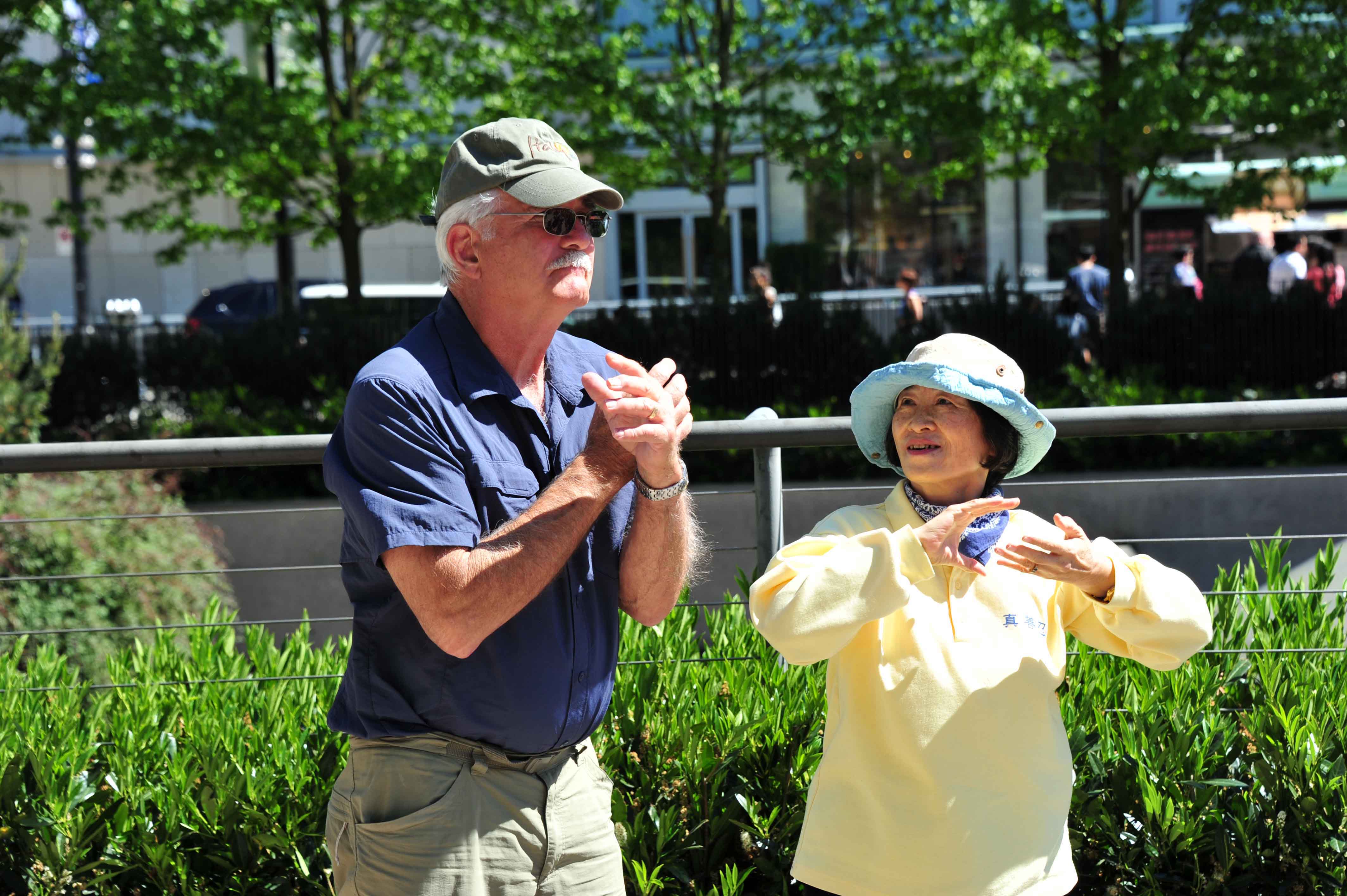 图10:华裔黄先生(身穿蓝衣者)路过活动现场,跟随法轮功学员完整炼了法轮桩法,他炼完后表示感觉能量很强。