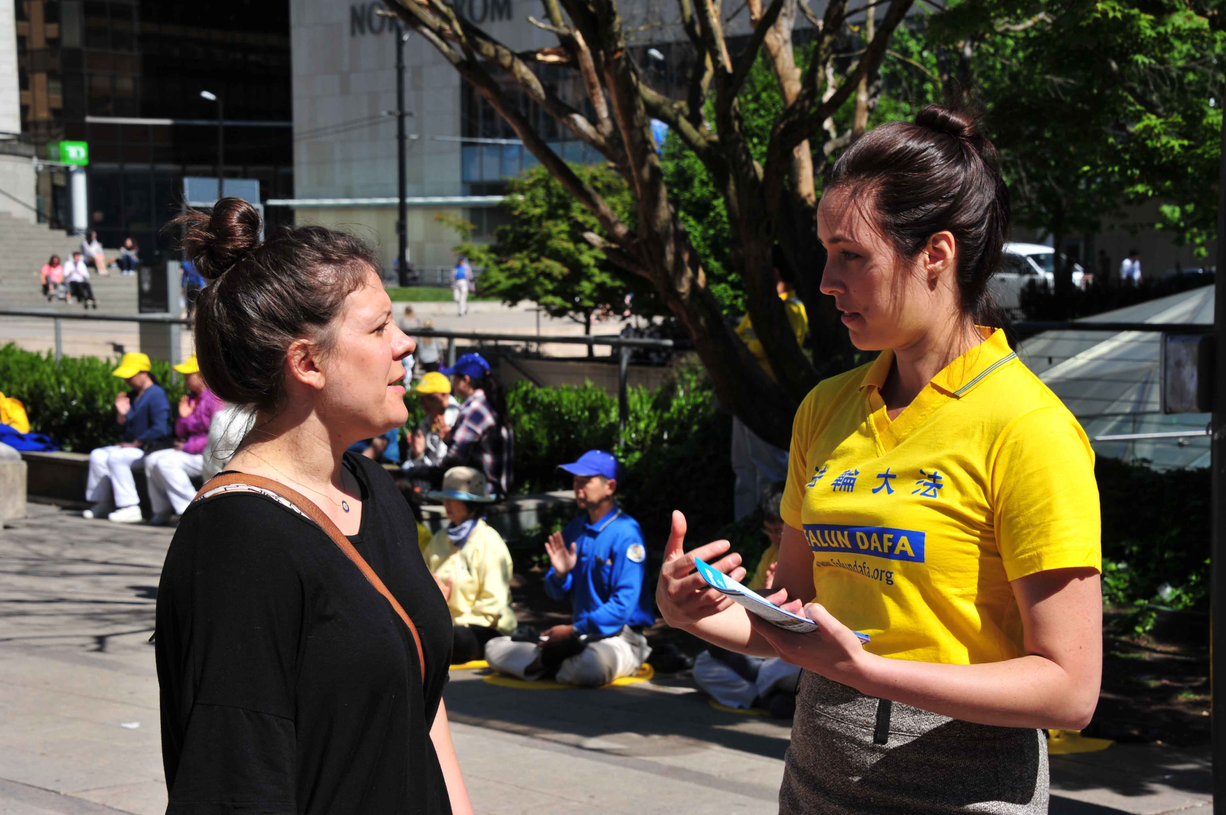 宋女士表示,她当天接触到很多当地民众,在了解到法轮功揭示了道德和健康的关系后,都很感兴趣而且纷纷签名支持法轮功学员反迫害。一对夫妇在了解了法轮功真相后,马上主动讲给他们的女儿, 最后一家三口都签名支持法轮功学员反迫害。法轮功学员秉持“真善忍”的理念,在多年的反迫害中,对正信的坚持、祥和理性讲真相的行为获得了加拿大社会的广泛支持和尊重。