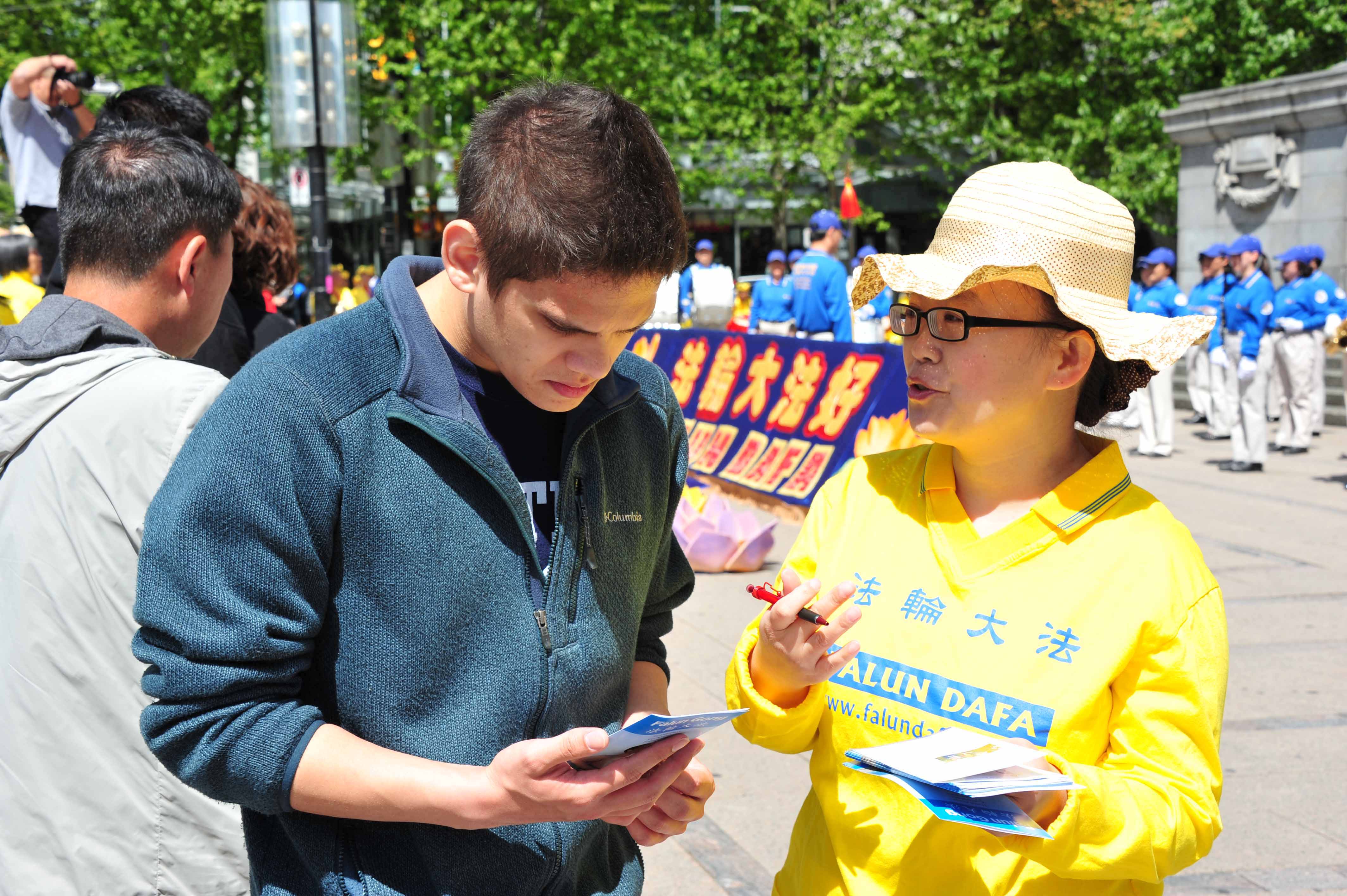 现场祥和的气氛,吸引了很多过路的民众停留观看,很多询问如何能学炼法轮功。还有好几位市民在庆祝活动现场就开始学功。华裔Henry黄先生路过庆祝活动现场,看到学员演示功法,他被祥和的气氛所吸引,马上询问,他是否也可以跟着法轮功学员炼?当得知法轮功功法都是免费教功时,他很高兴。他立刻跟随法轮功学员的动作和音乐,完整地将法轮功第二套功法——-法轮桩法炼了一遍。
