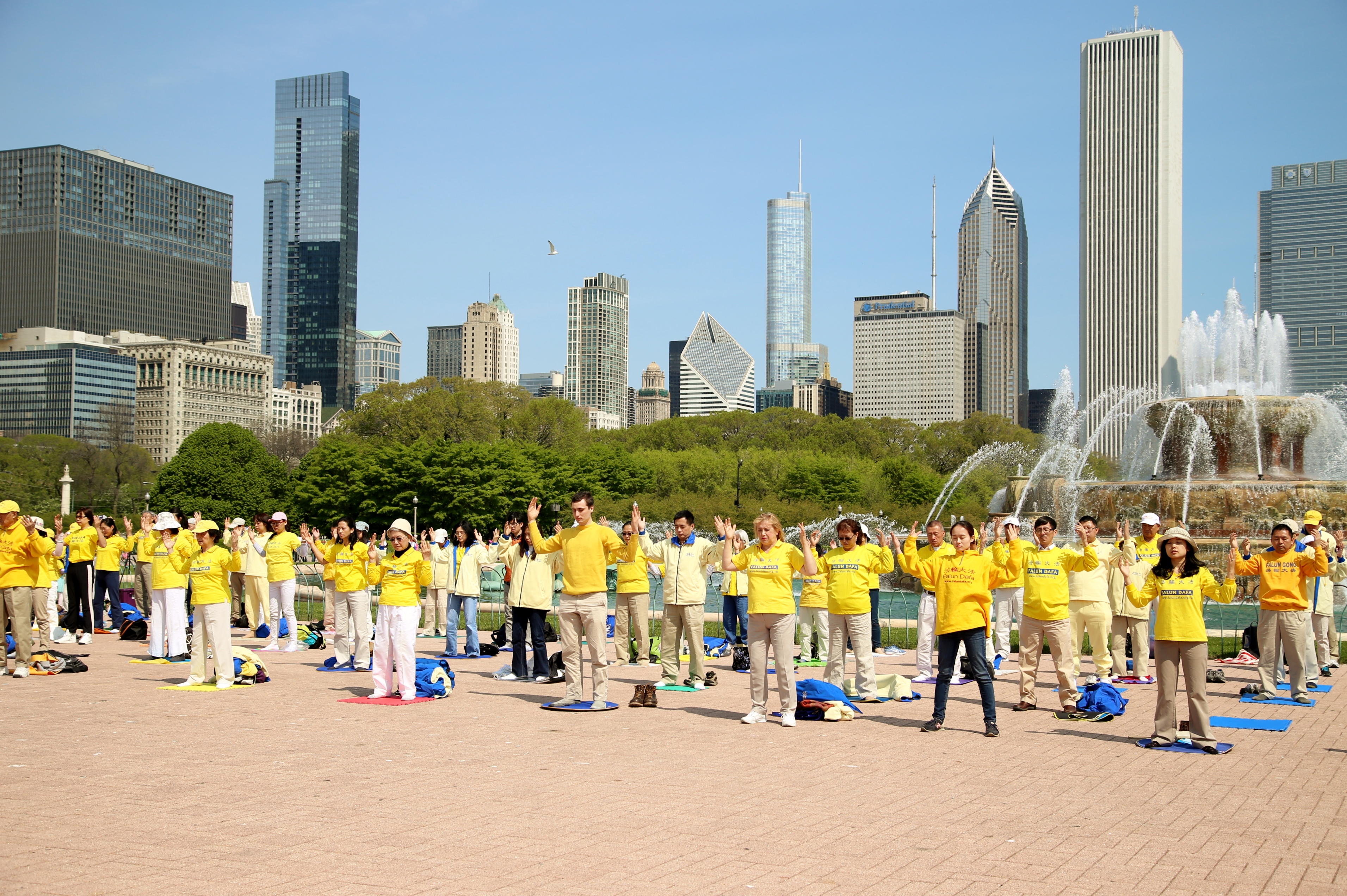 ![]() 图2-4:大芝加哥地区法轮功学员在白金汉喷泉广场集体炼功 |