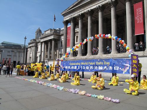 ![]() 图2-5:庆祝“五一三”世界法轮大法日,英国法轮功学员在伦敦鸽子广场集体炼功,展示法轮大法的美好。 |