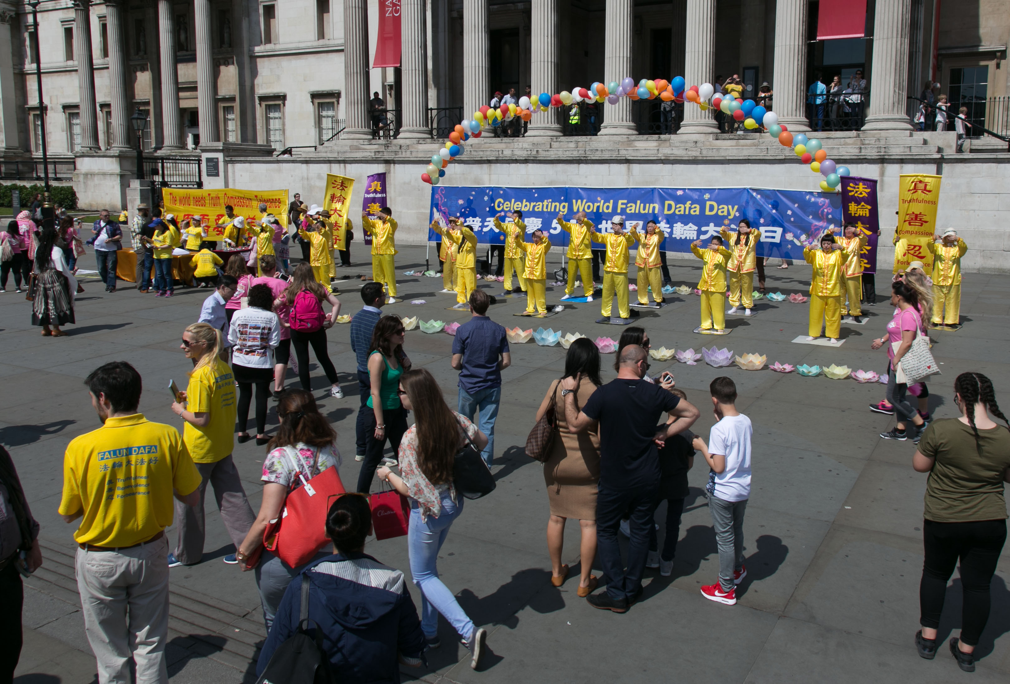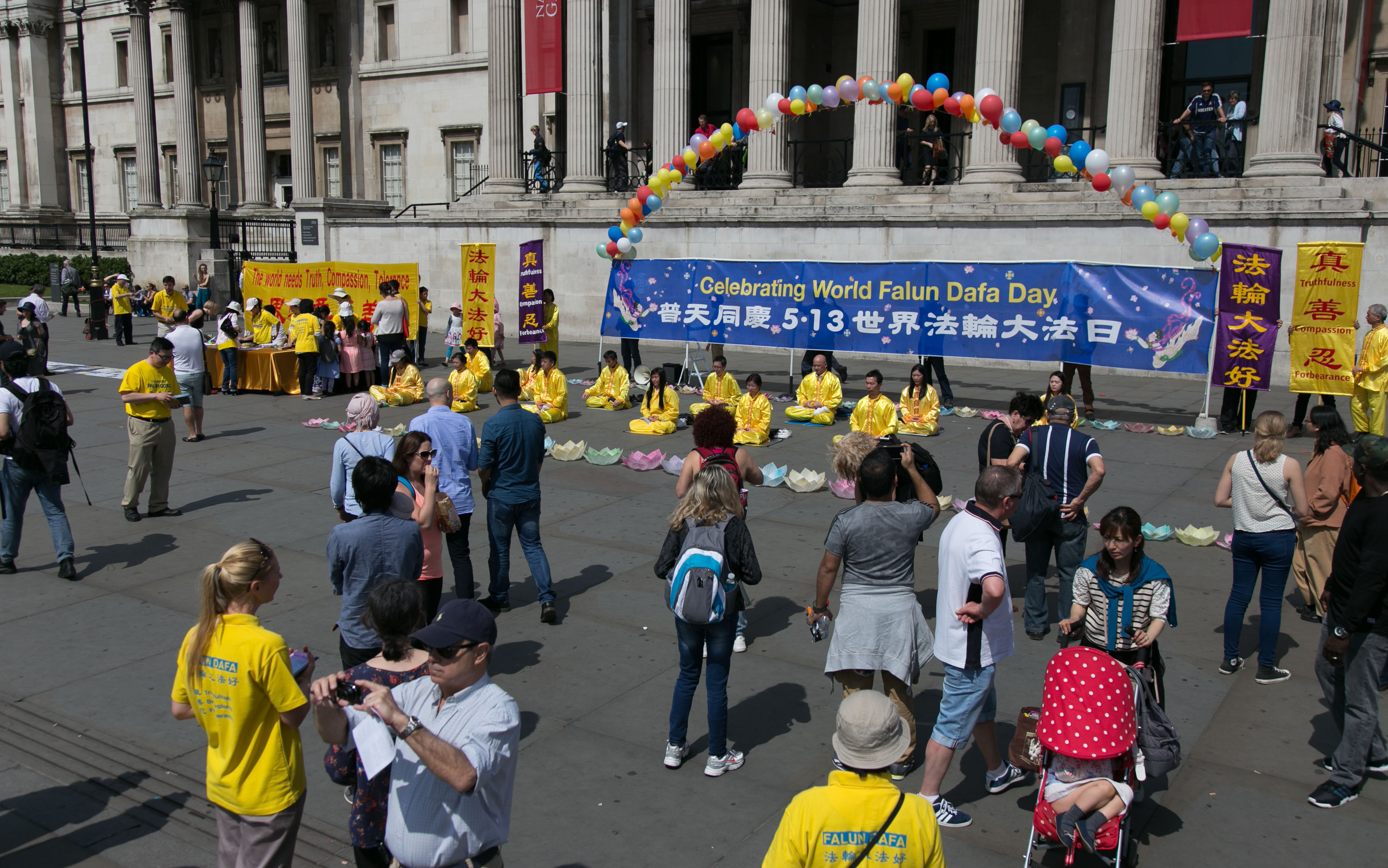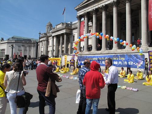 这是二零一六年开春以来英国天气最好的一天,阳光普照,晴空如碧。 “普天同庆5•13世界法轮大法日”的巨大横幅清新醒目,其两侧对称摆置着“法轮大法好”和“真善忍”条幅,横幅之上,装饰着一道用七彩气球搭起的彩虹。身着金黄色炼功服的法轮功学员在横幅前炼功。在横幅旁边,是法轮功学员设立的真相信息台,上面放有介绍法轮功真相的多种资料以及呼吁世界政府和民众支持法轮功学员反迫害、要求中共停止迫害法轮功、停止活摘法轮功学员器官的征签表。另外,多名法轮功学员在人群中发放真相传单和讲真相。