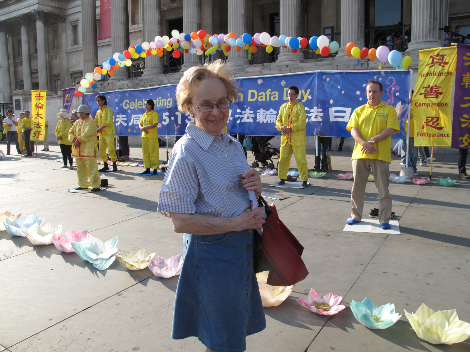 已经九十二岁的莉娜(Leena)祖籍波兰,在英国生活四十多年了,现居伦敦,体态优雅行动自如的老人家看起来比她的年龄年轻很多。看到她面带快乐笑容驻足良久观看法轮功学员炼功,有学员走上前去跟老人打招呼。她介绍说自己几天前途经圣马丁广场时遇到了法轮功学员,被法轮功真相所震撼和吸引,法轮功学员向她提及了将在五月八日举行的庆祝法轮大法日的活动,结果莉娜老人在人陪伴下专程来了,她对法轮功学员说:“看到你们把这样的(大法美好)信息带到这里,我太高兴了!”并表示要感谢法轮功学员,她自己好像一生都在等这个信息。