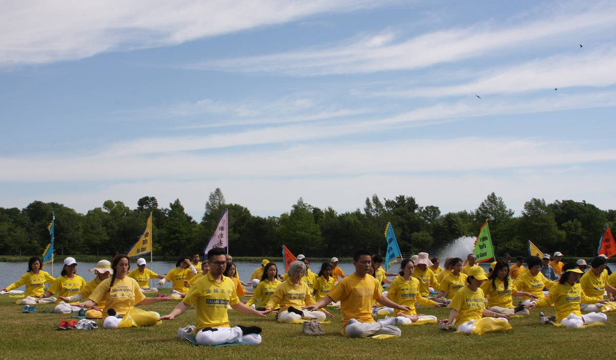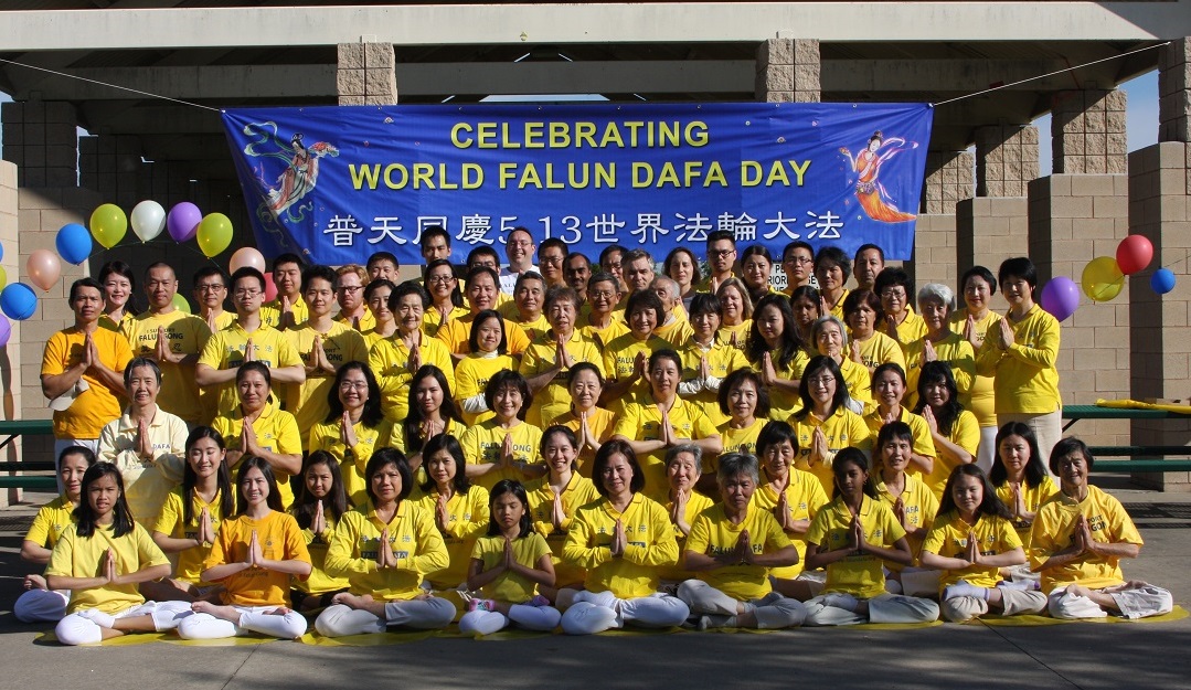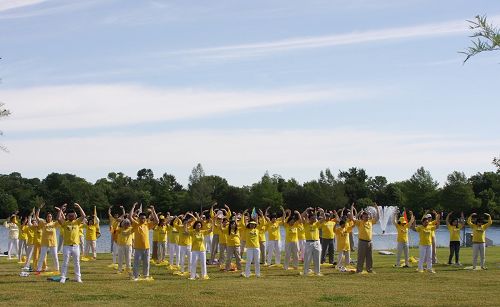 ![]() 图1-2:达拉斯学员集体炼功庆祝世界法轮大法日 |