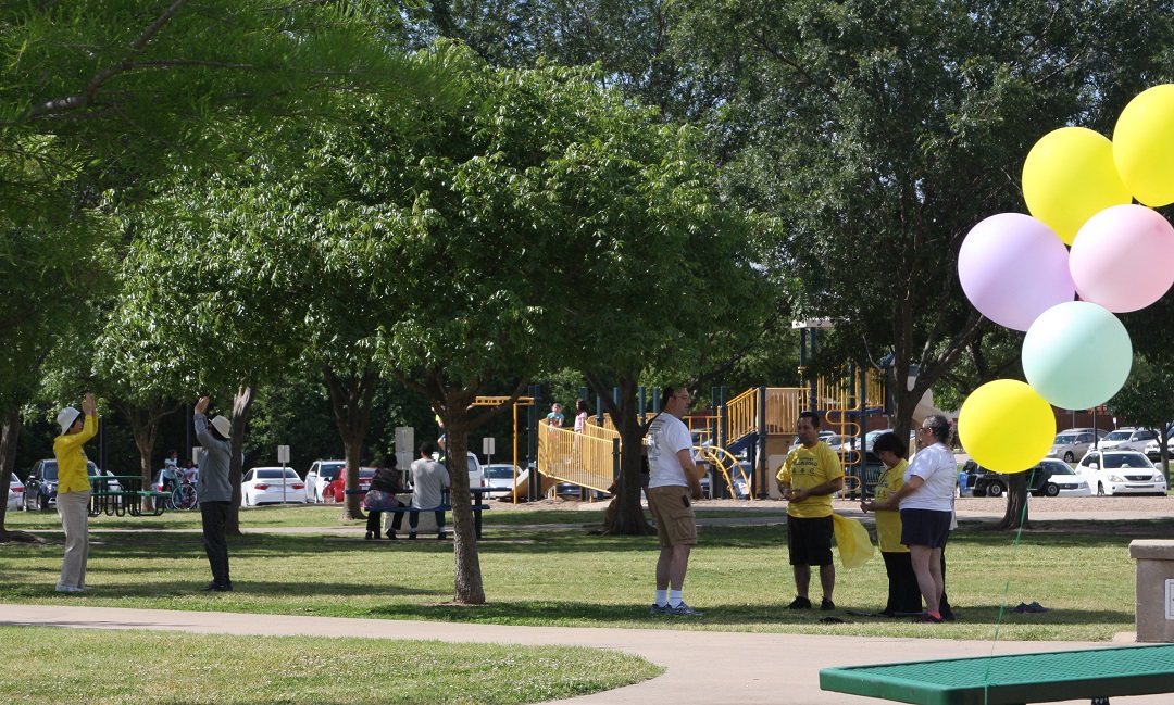 五月是北德州最宜人的时节,蓝天白云,春风拂面,令人心旷神怡。Russell Creek公园是当地居民喜爱的周末休闲好去处,来这里散步,与亲朋好友相聚的人总是很多。附近的法轮功学员在这里的炼功点已坚持了多年,今年的法轮大法日庆祝活动也再次在这里举办。