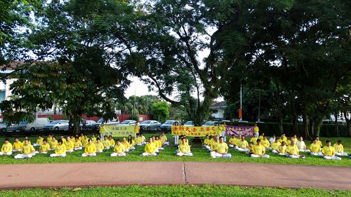 图6-8:二零一六年五月八日,法轮功学员来到首都吉隆坡著名旅游景点——蒂蒂旺莎湖滨公园举行集体炼功,纪念法轮大法洪传二十四周年。