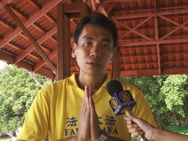 谈到得法后的修炼体会,关锦河的眼泪不由自主地夺眶而出:“我在得法的一个星期里面,就把我抽了十五年的烟给戒了。得法后我的身心变化很大,我家人看到我的改变了。我的父母,我的太太,就是说吵架减少了。然后我知道以前还没得法的时候做的错事太多了,为了名,为了利,去争去斗,得法后都改过来了。跟以前吵架的人都变好了,尤其是家里人,所以现在家里人都很支持我炼功。