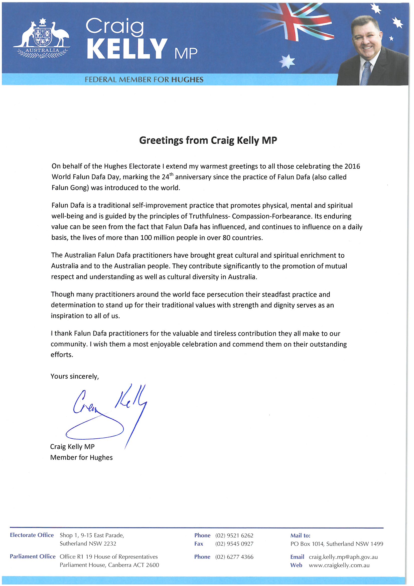 凯利议员在他的贺信中说:“我代表休斯选区向所有庆祝二零一六年“世界法轮大法日”,纪念法轮大法洪传二十四周年的人们致以最热烈的问候。”