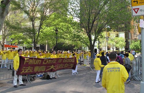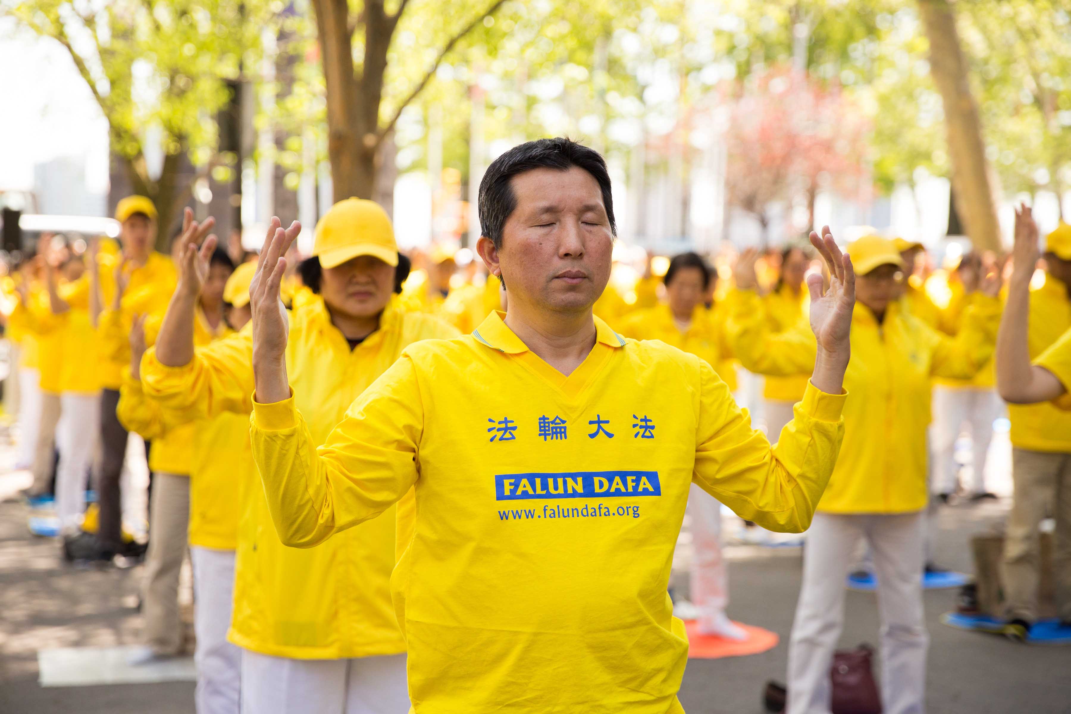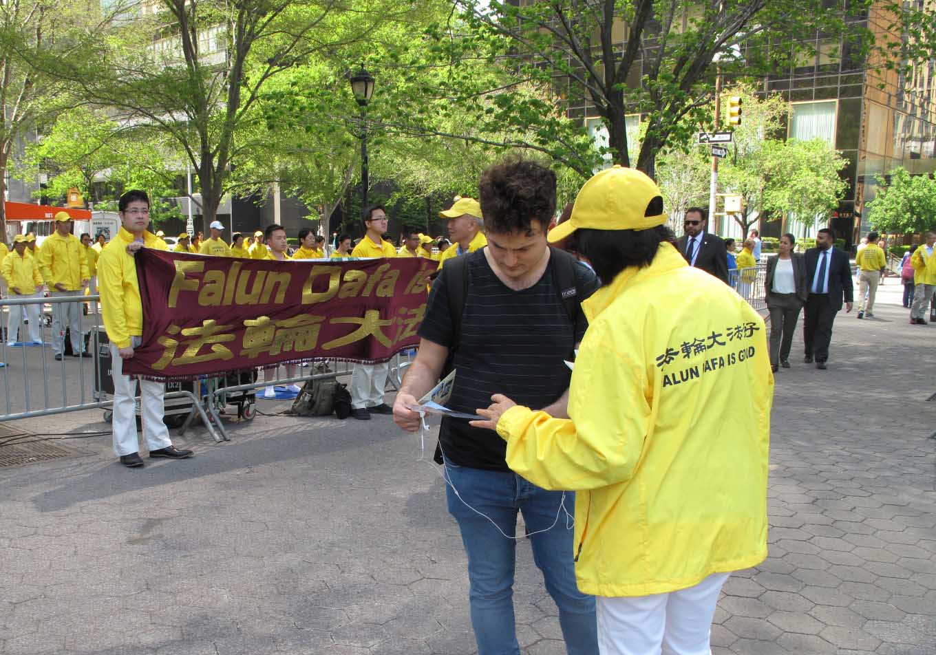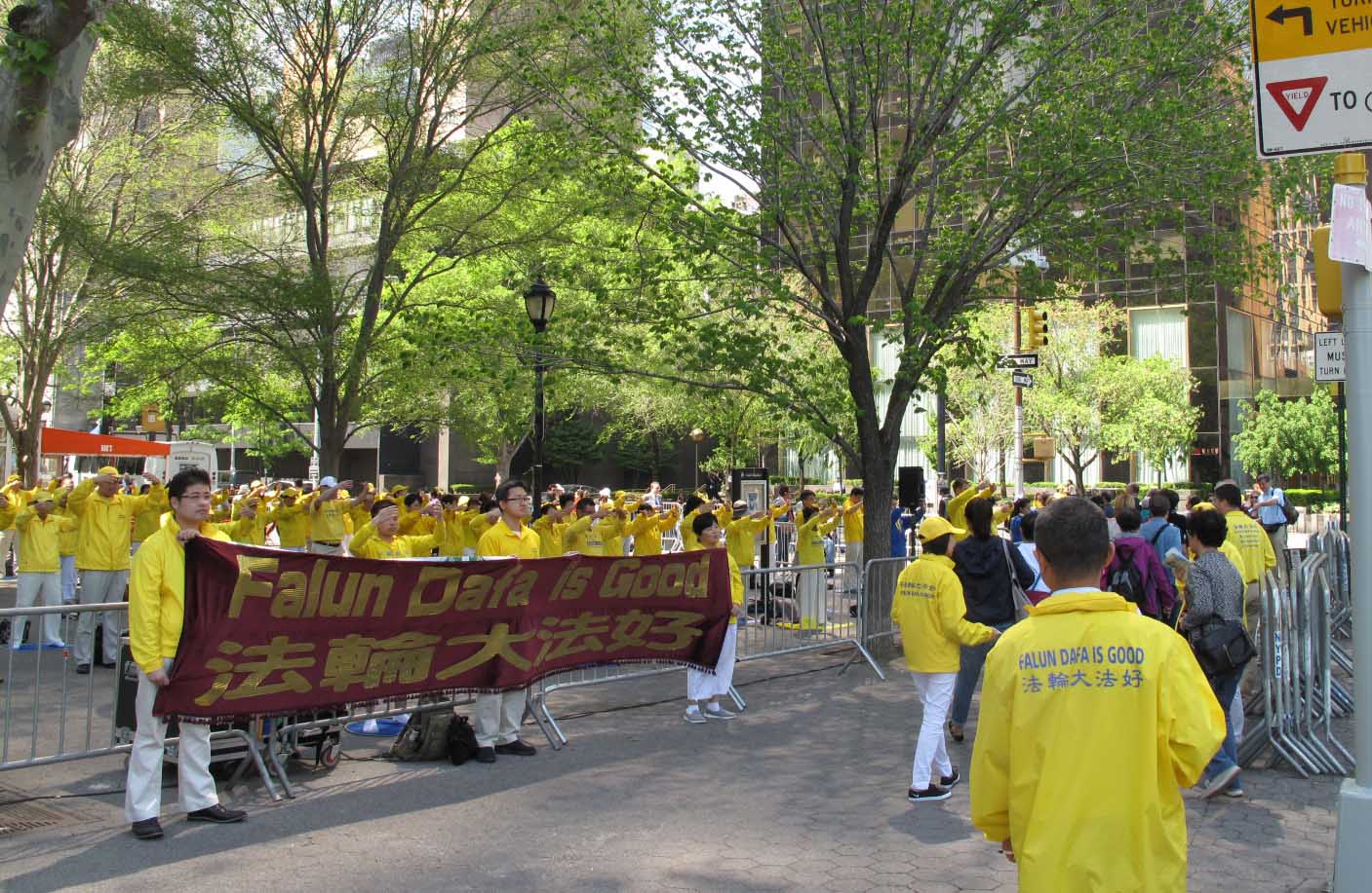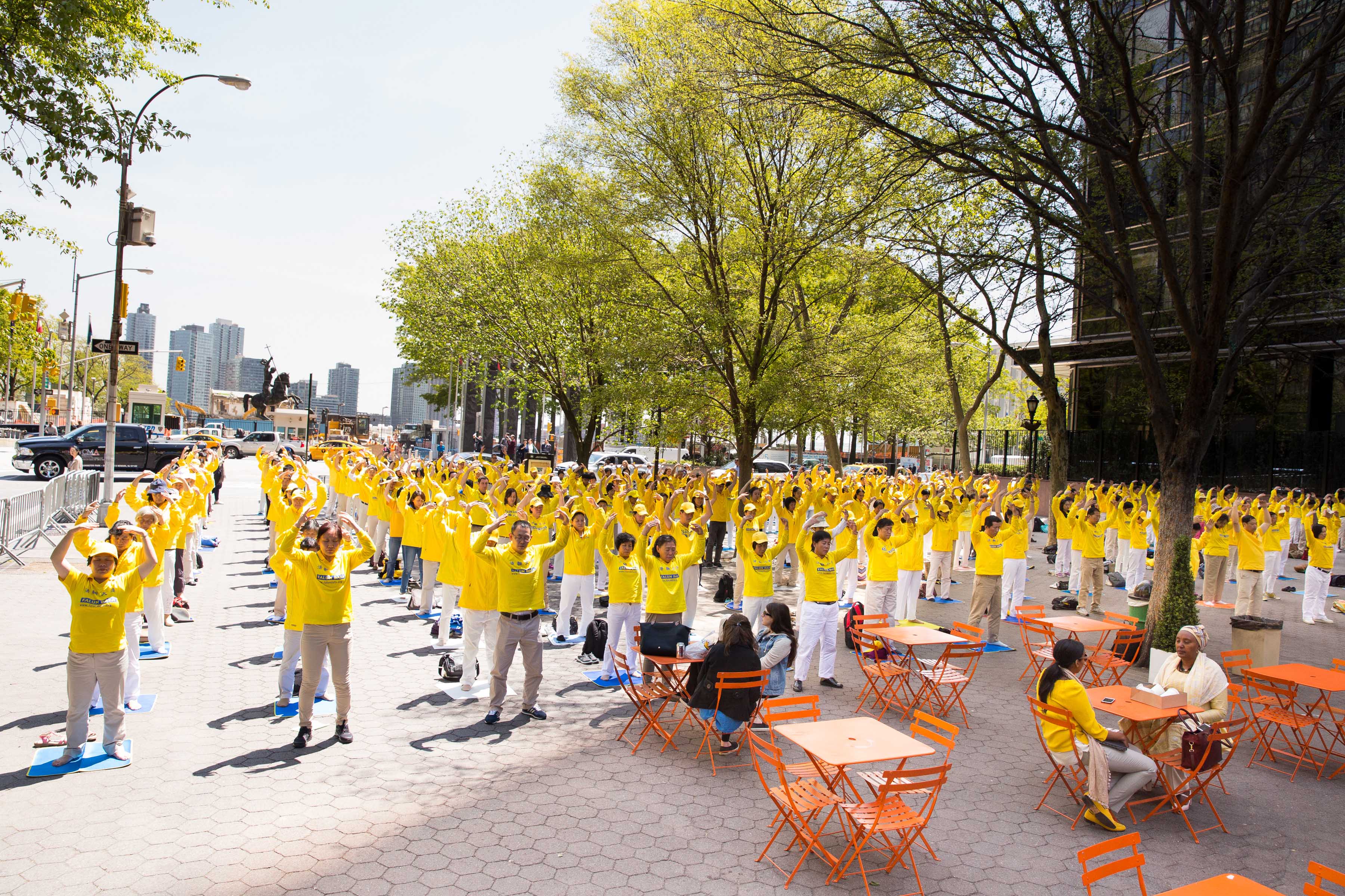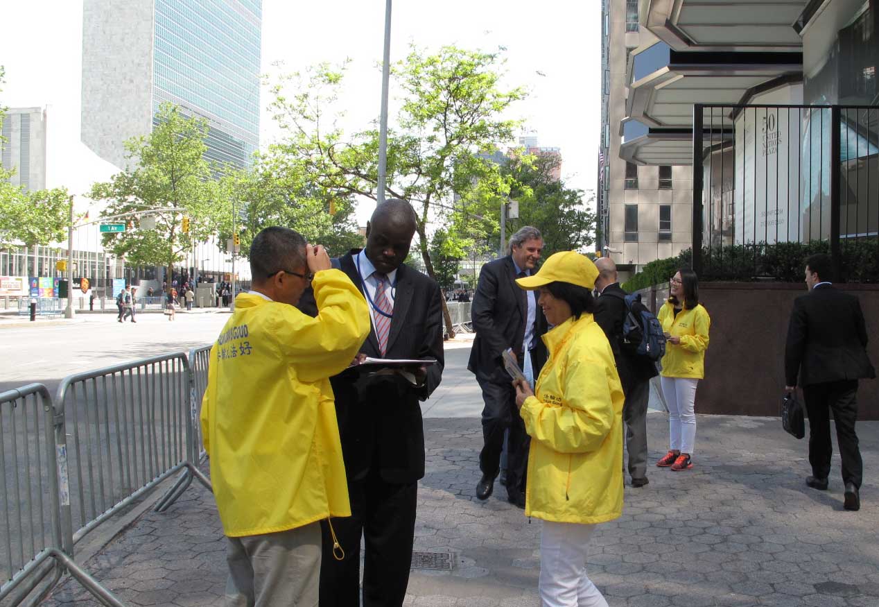 法轮功学员身穿“法轮大法好”黄色体恤衫,在灿烂阳光的照耀下,呈现金黄一片的亮丽风景;而在曼哈顿的车水马龙环境中,伴随祥和美好炼功音乐专注打坐的一个硕大的安静的人群,又恰如一块飞来的净土。集体炼功的法轮功学员吸引了过往民众的关注,其中包括那些往往脚步匆匆的联合国工作人员,他们中不少人接过真相传单,还有一些人停下脚步认真聆听法轮功学员深入讲解真相,并签名谴责中共迫害法轮功。