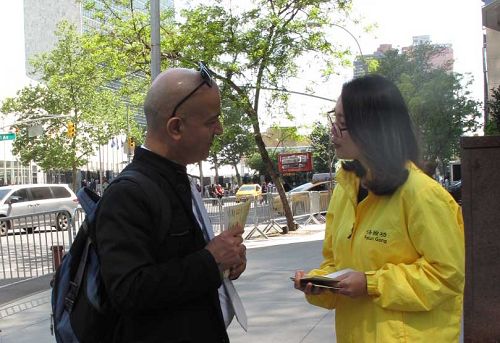 ![]() 图12:五月十二日,住在纽约的安东尼娅在联合国前偶遇法轮功学员,得以深入了解真相。 |