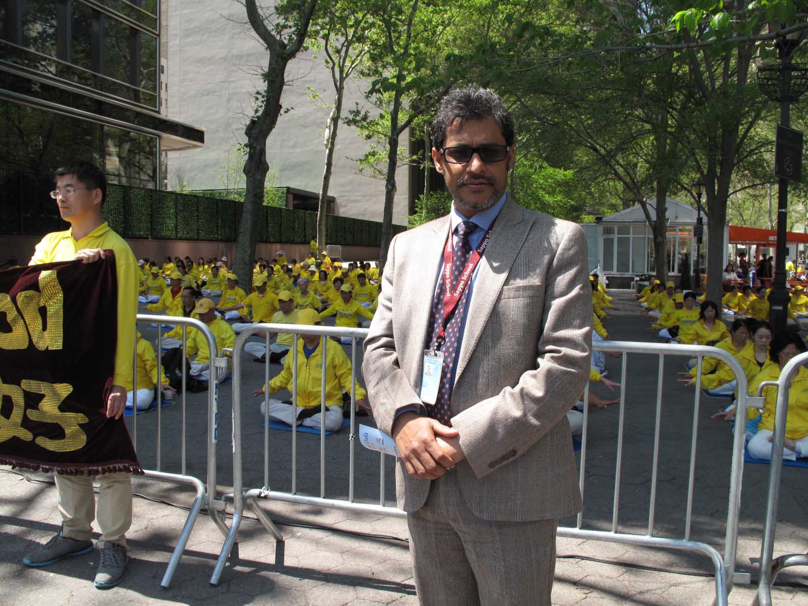 科威兹(Quazi Johirul Islam)是一位在联合国工作的孟加拉国的游记作家和诗人,已出版了三十二本书,其中有些被翻成英文出版,在联合国工作五年了。当天是他第二次看到法轮功学员。他表示当看到法轮功学员脸上表情的宁静祥和、集体炼功场面并听学员讲真相后他突然意识到法轮大法是非常了不起的、不能忽视的。