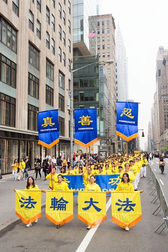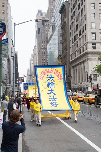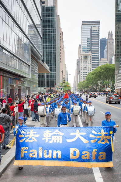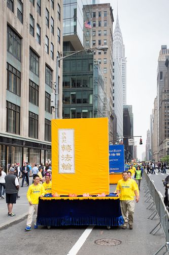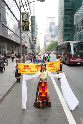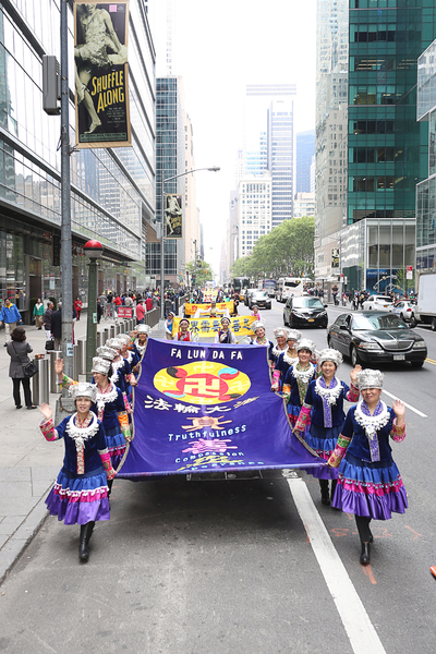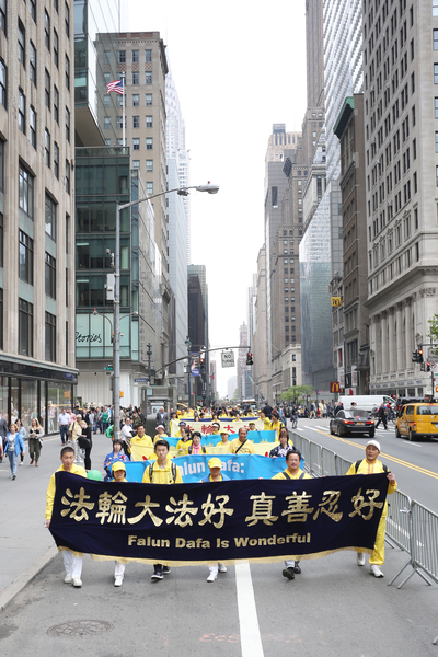 【明慧网二零一六年五月十九日】(明慧记者德祥、李晓美国纽约报道)今年世界法轮大法日,二零一六年五月十三日,近万名来自五十三个国家不同族裔的法轮功学员在美国纽约举办的大游行予以庆祝,全程历时三个半小时,从联合国广场,横穿曼哈顿主要街道之一四十二街,最后抵达中领馆附近的十二大道,三个大方阵组成长长的队伍一望无边,最前面开道的第一方阵已经抵达终点,第三方阵的一批学员还在等待出发,令道路两旁观众感到非常震撼。