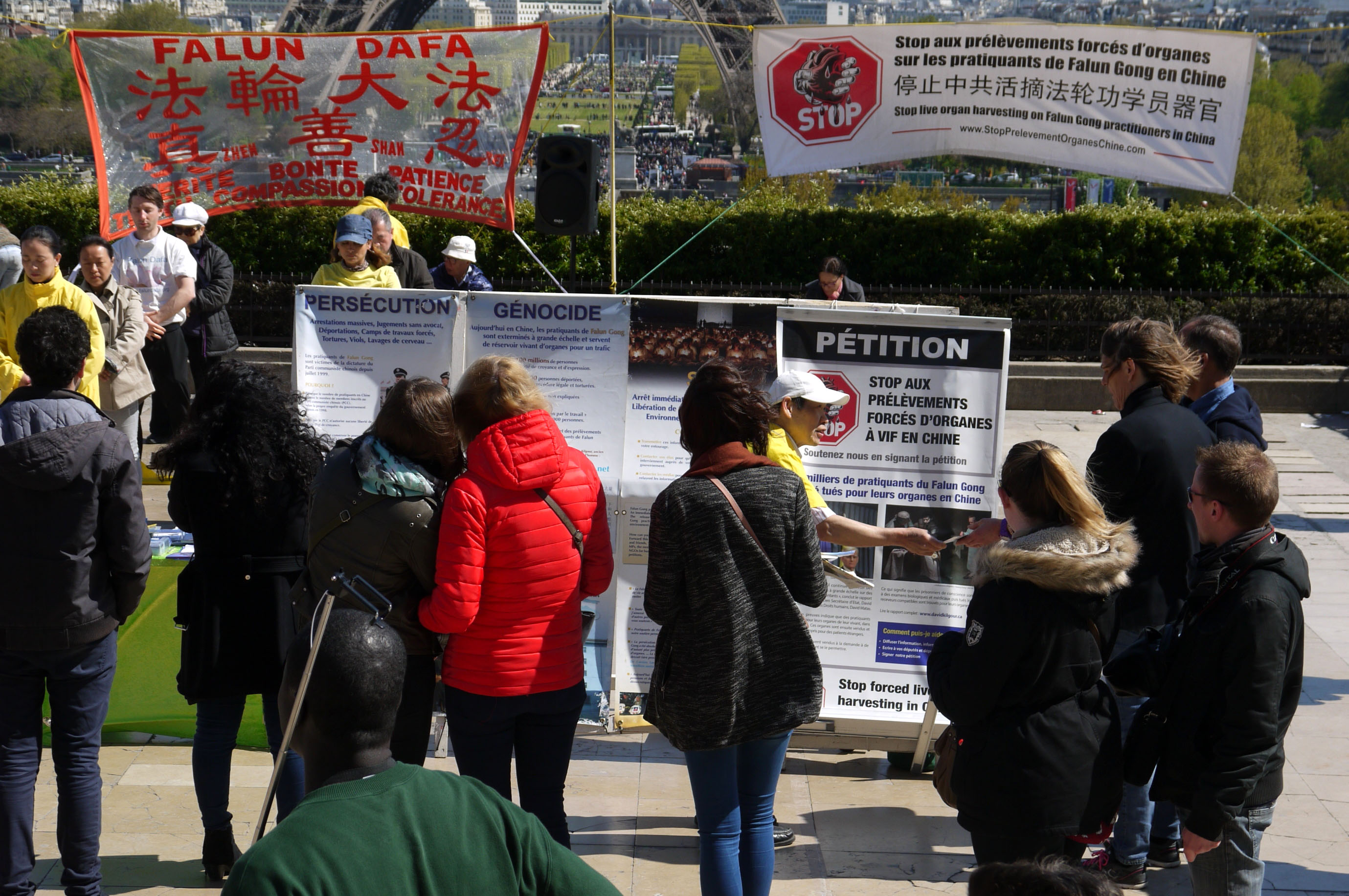 【明慧网二零一六年五月二日】(明慧记者周文英巴黎报道)二零一六年五月一日是法国的劳动节,下午,法轮功学员聚集在巴黎人权广场,向来自世界各地的游客及法国民众演示法轮功功法,揭露中共迫害,同时征集签名,反对中共活体摘取法轮功学员器官,并呼吁在全球范围内审判迫害元凶江泽民。