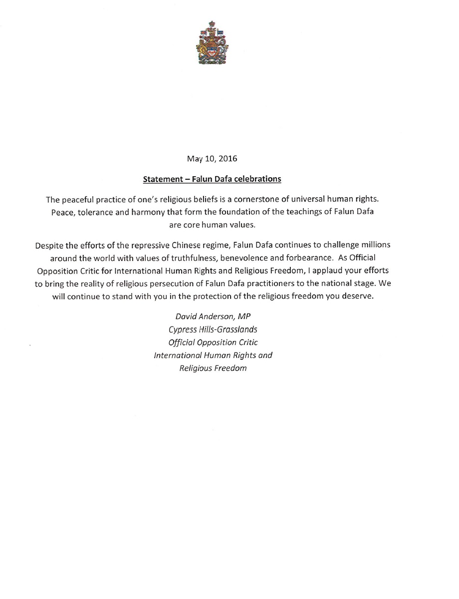 作为国际人权与宗教自由机构的官方反对党评论家,我赞扬你们向国家层面揭示出(中共)迫害法轮大法学员的真相。