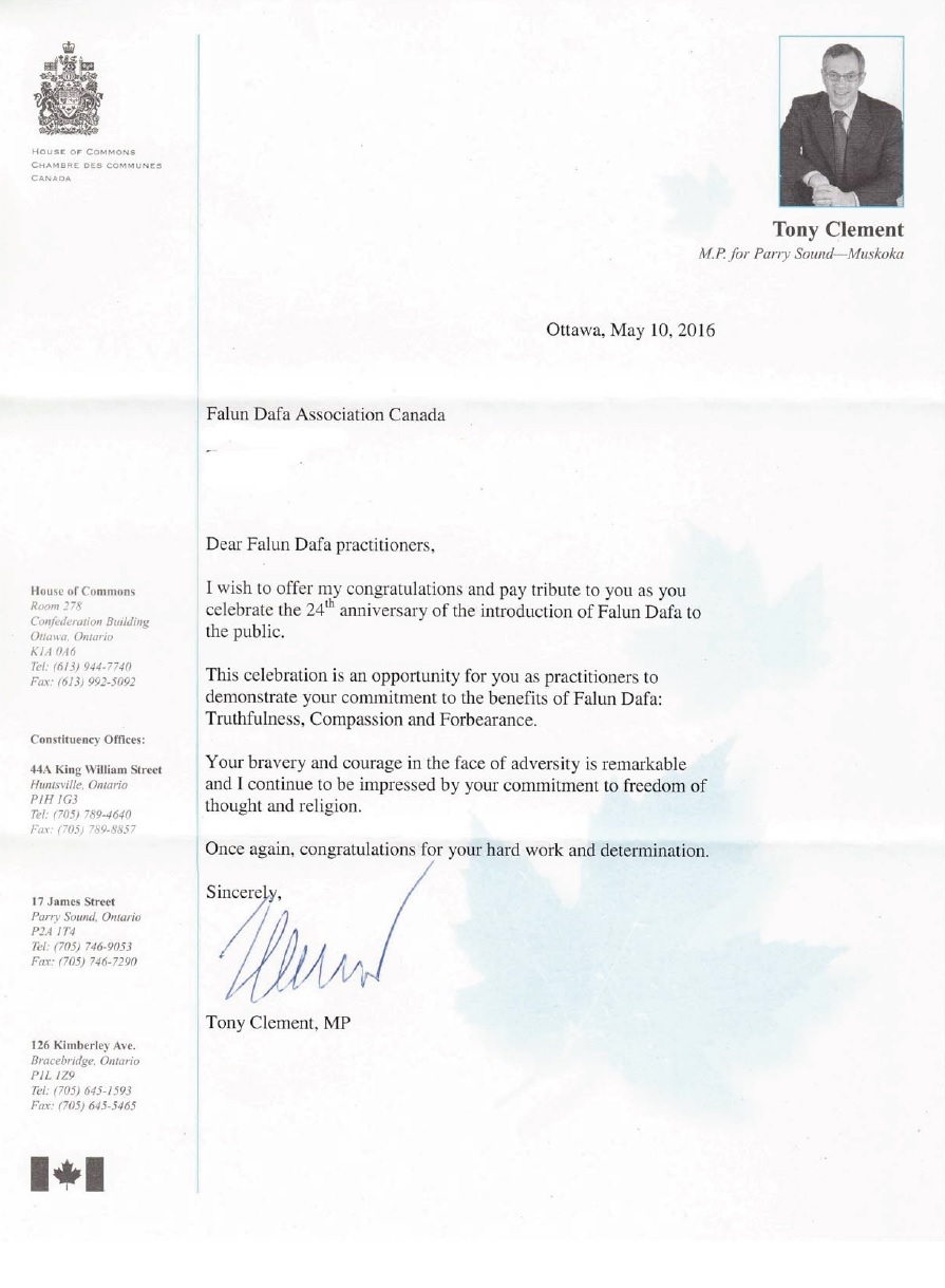 国会议员克莱门特(Tony Clement)的贺信