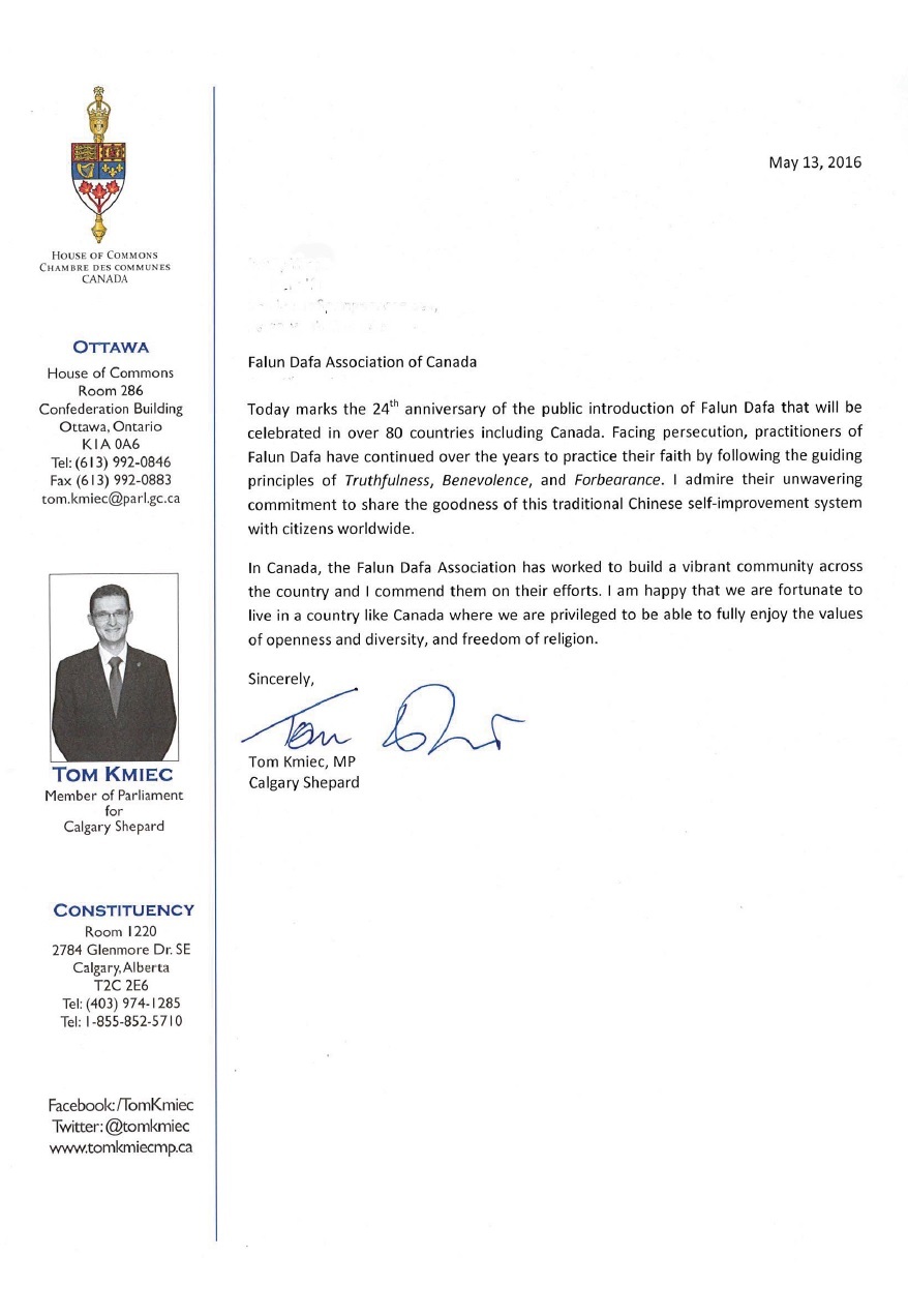 在这个纪念法轮大法传世二十四周年的时刻,回顾和实践真、善、忍的原则。我为加拿大法轮大法学会传播这样的教诲,以及成为促进各社区协和、宽容、相互尊重和理解的典范,表示祝贺。